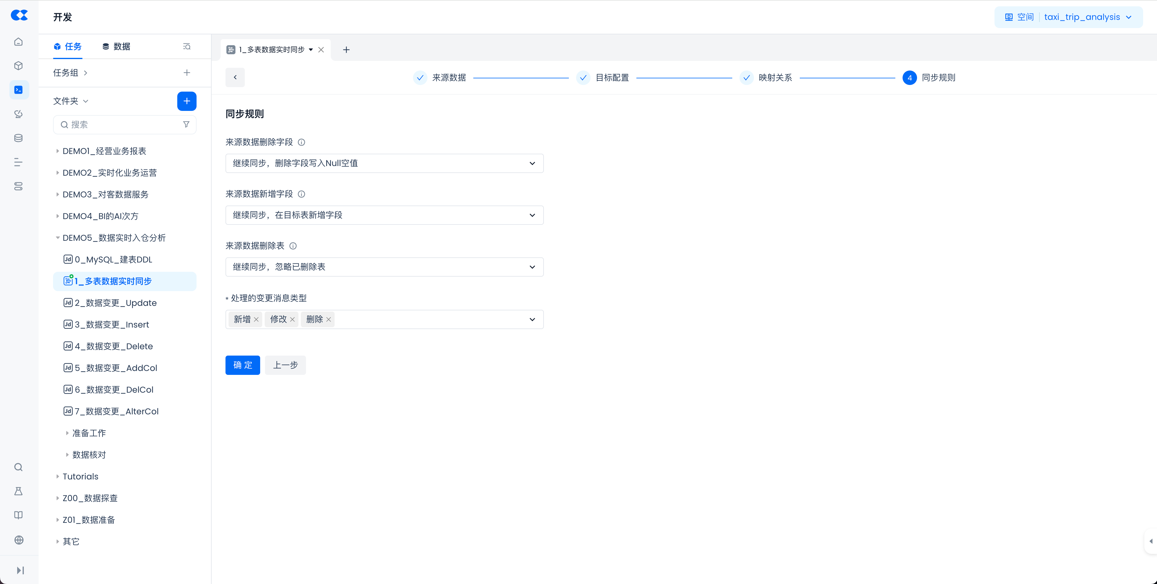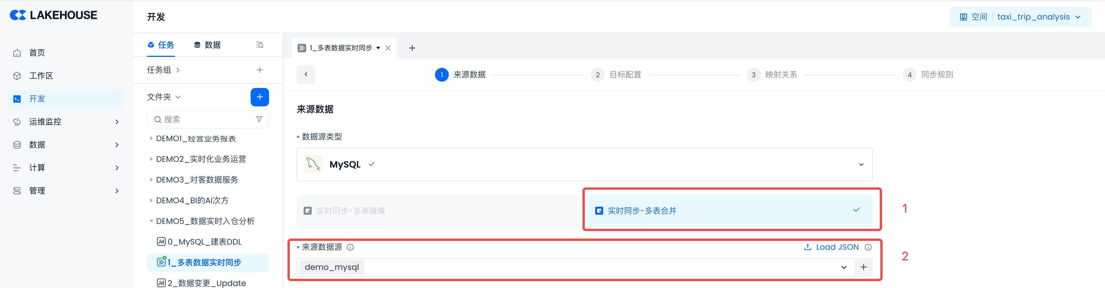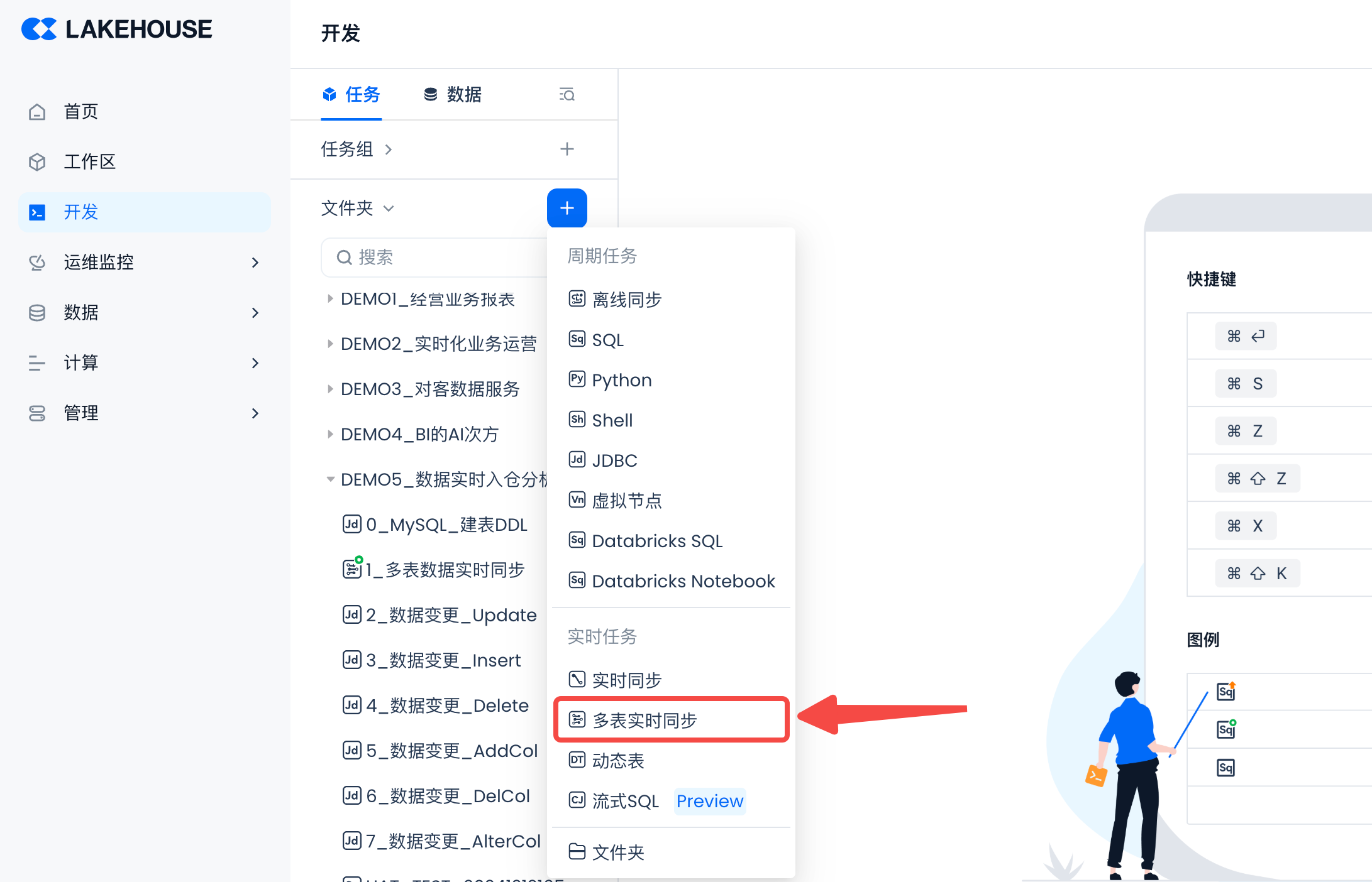 首先在任务开发里点击新建”多表实时同步任务“,选择正确的源端数据源类型,比如 MySQL。