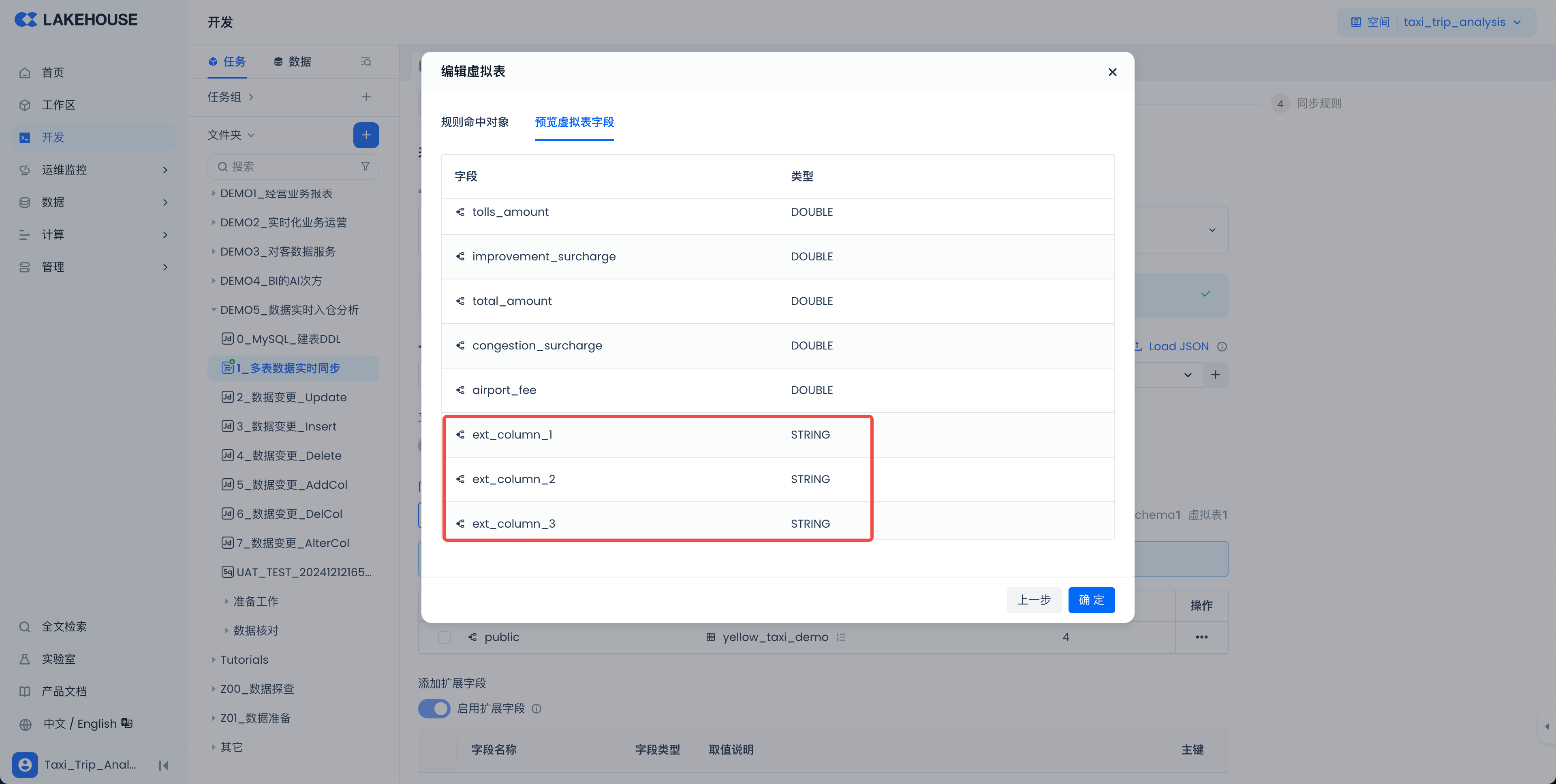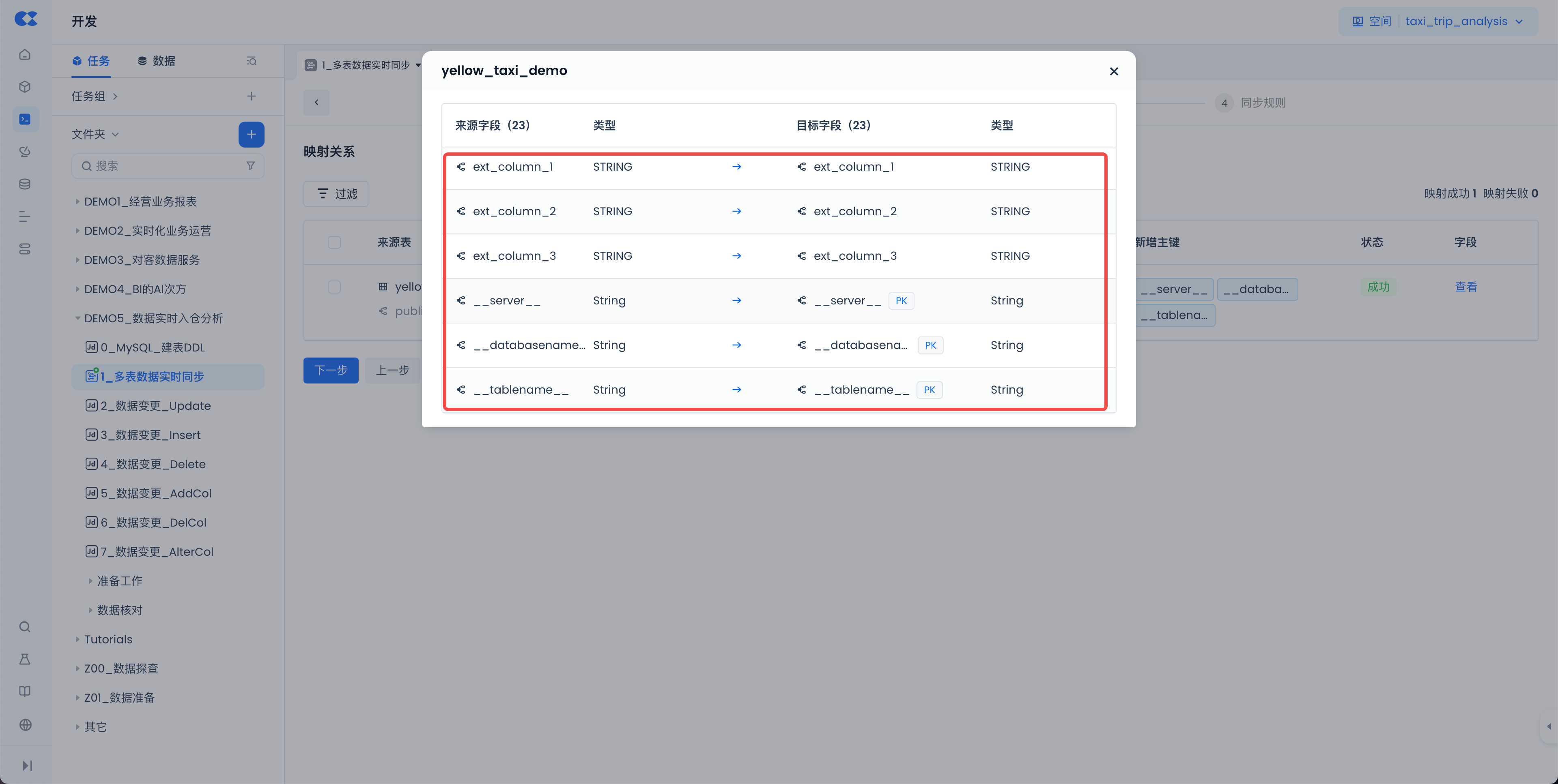接下来可以在映射关系中预览同步的字段配置,可以看到扩展字段包含在内,扩展字段/联合主键也在这里有所体现。
