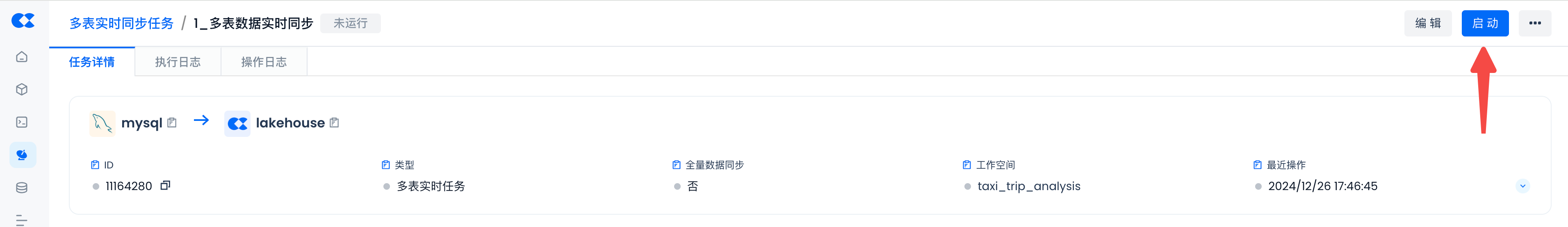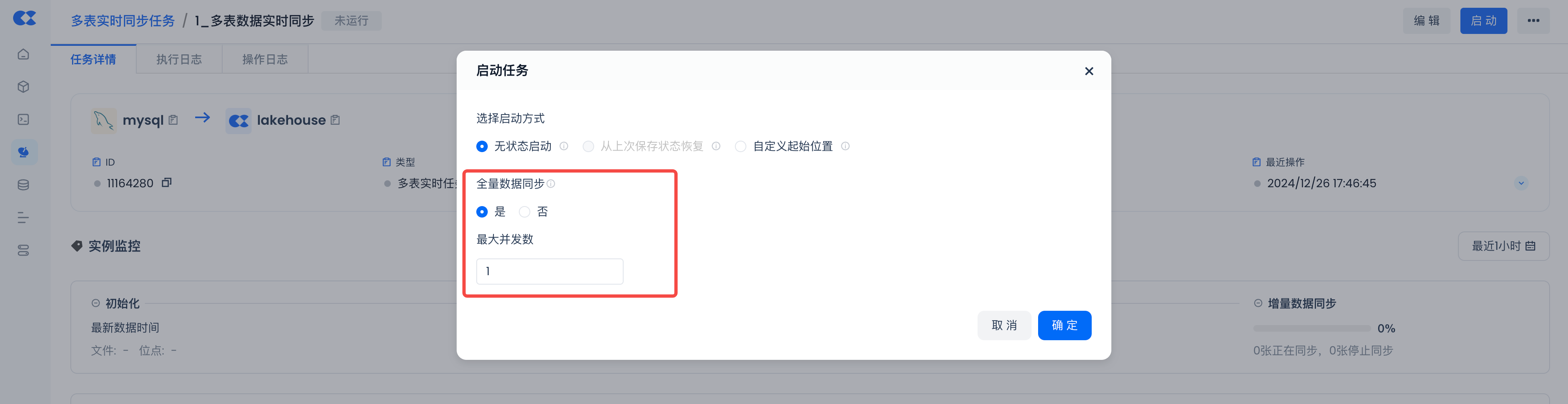 启动多表实时同步任务:启动时,可以根据实际需求,选择是否进行全量数据同步。首次同步的数据,通常建议选择做一次全量数据同步,然后再进行增量数据同步。