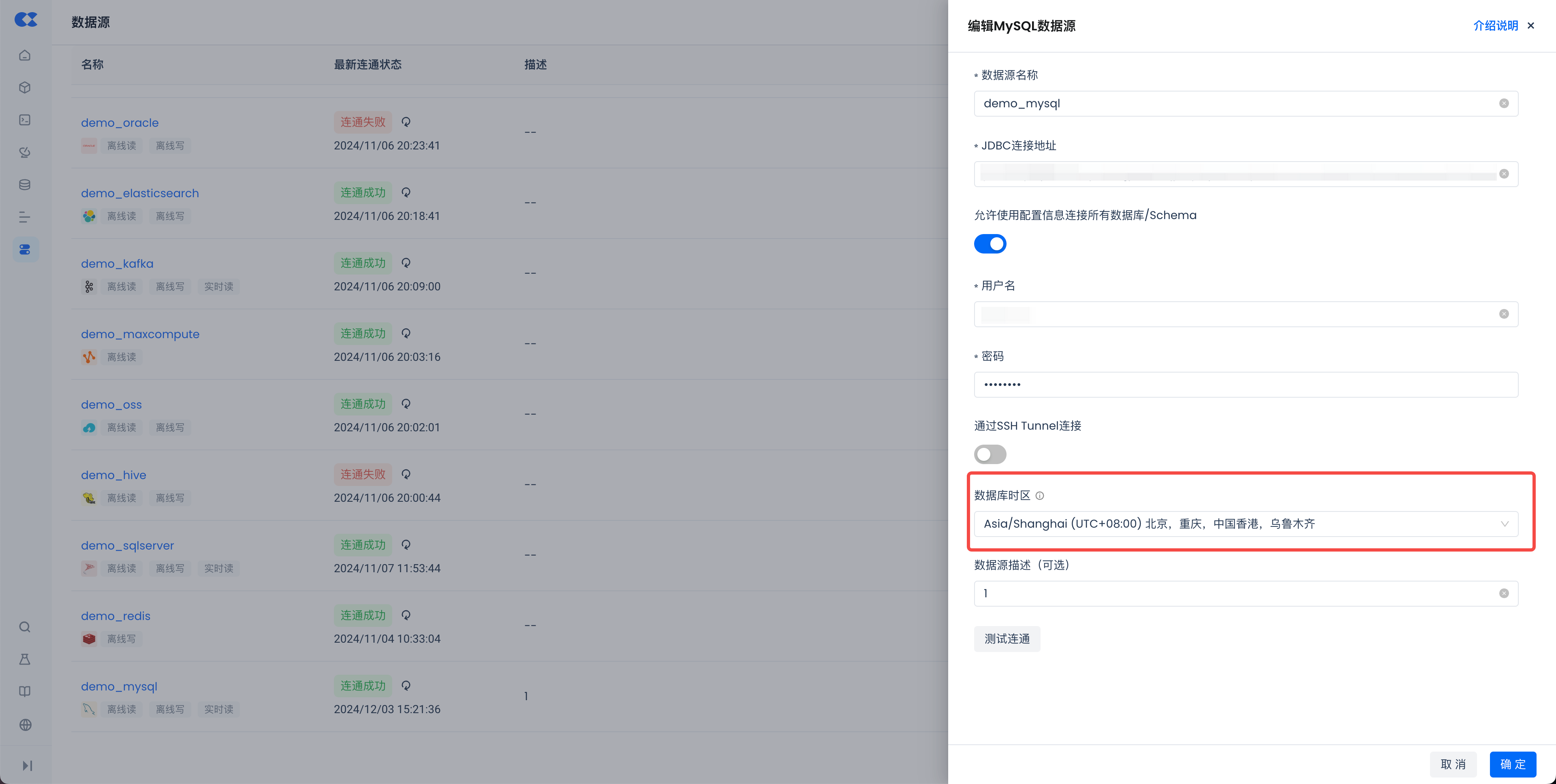 导航到管理 -> 数据源,单击”新建数据源“并选择MySQL,即可创建本案例中所需的数据源。填写必须的配置信息,尤其请注意选择正确的数据库所在时区,实时同步对时区敏感,配置错误会使得同步失败。