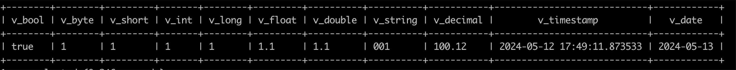 CREATE TABLE spark_connector_test_table( v_bool boolean, v_byte byte, v_short short, v_int int, v_long long, v_float float, v_double double, v_string string, v_decimal decimal(10,2), v_timestamp timestamp, v_date date );
