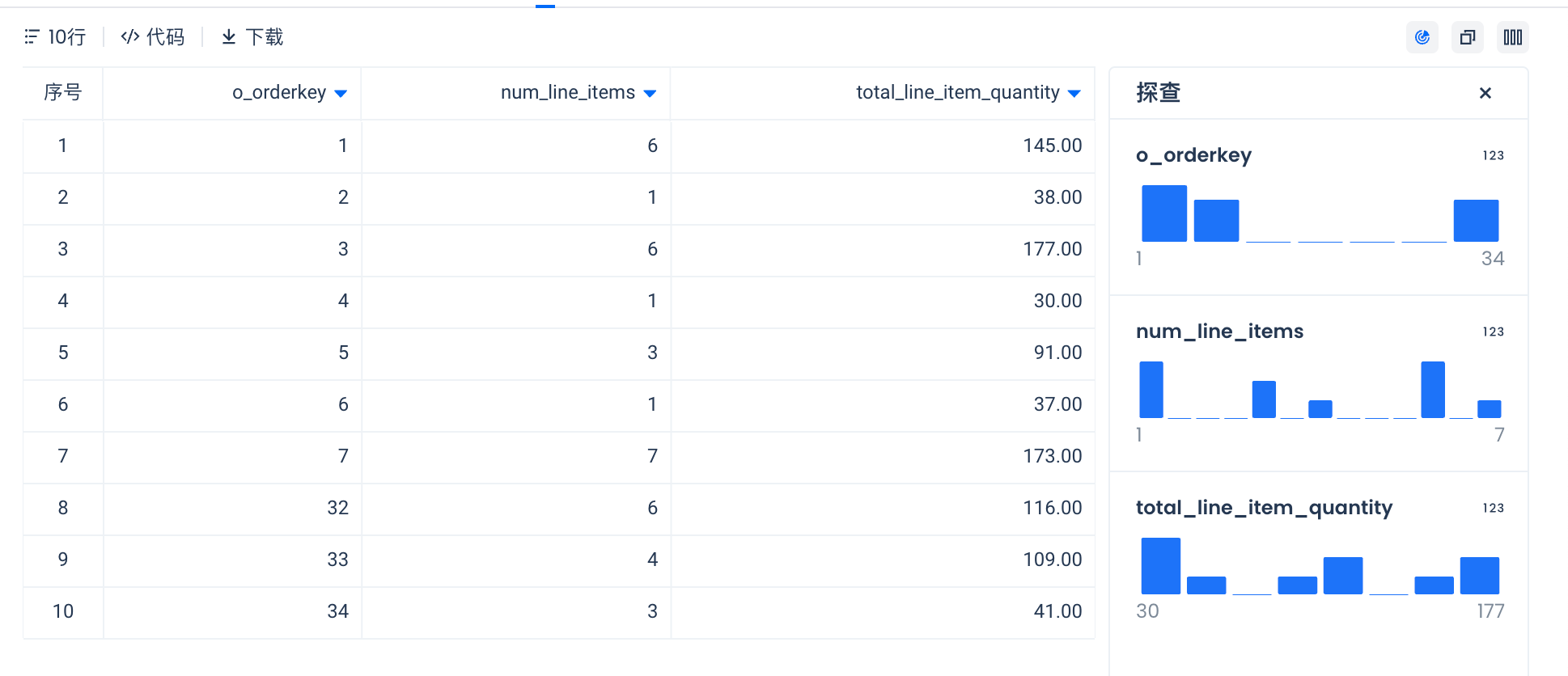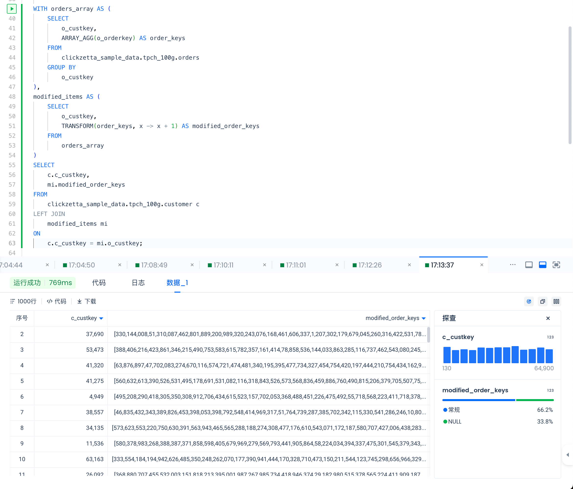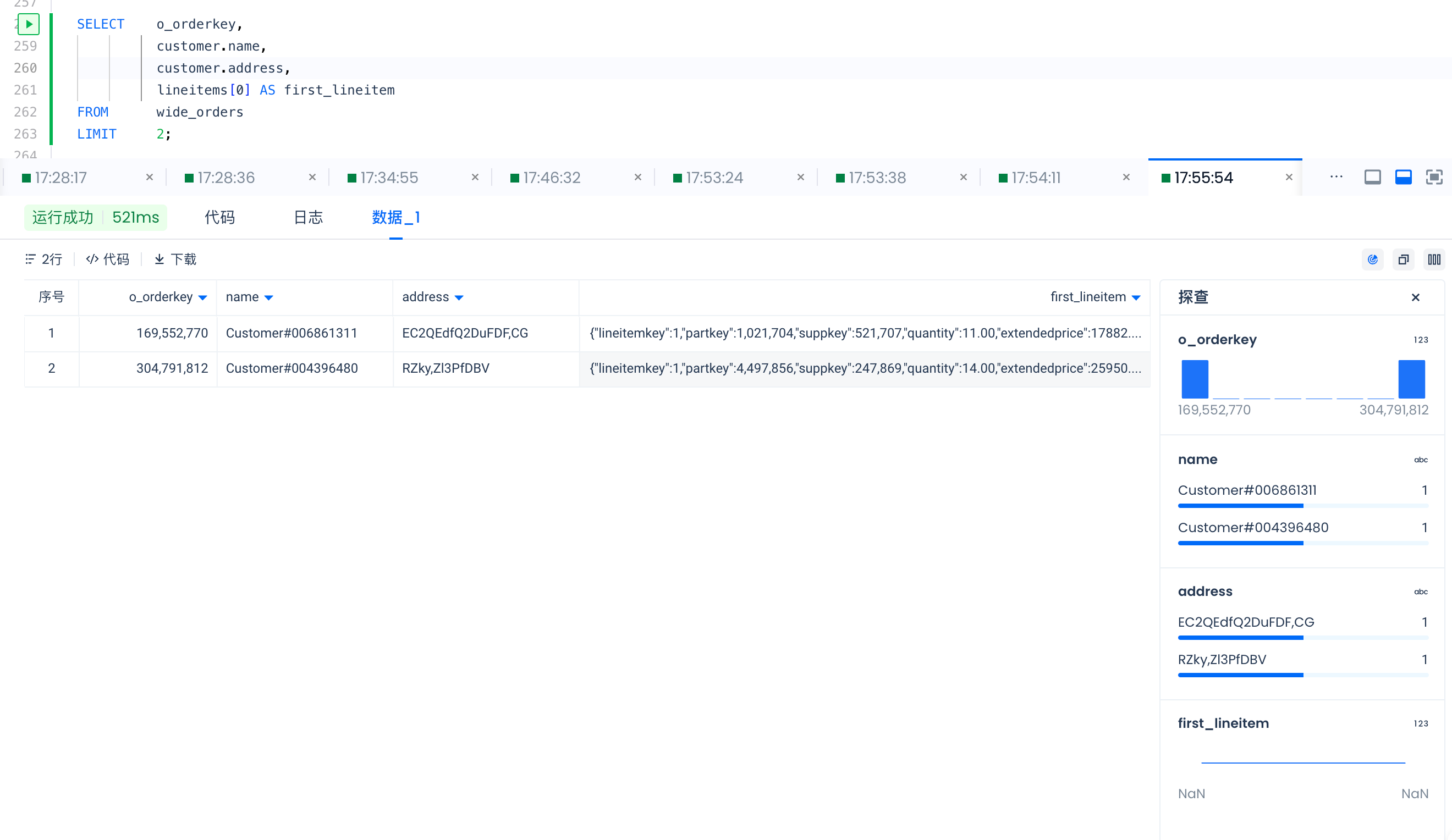 -- 获取 lineitem 指标 WITH lineitems AS ( SELECT o.o_orderkey, UNNEST (o.lineitems) FROM wide_orders o ) SELECT o_orderkey, COUNT(lineitemkey) AS num_line_items, SUM(quantity) AS total_line_item_quantity FROM lineitems GROUP BY 1 ORDER BY 1 LIMIT 10;