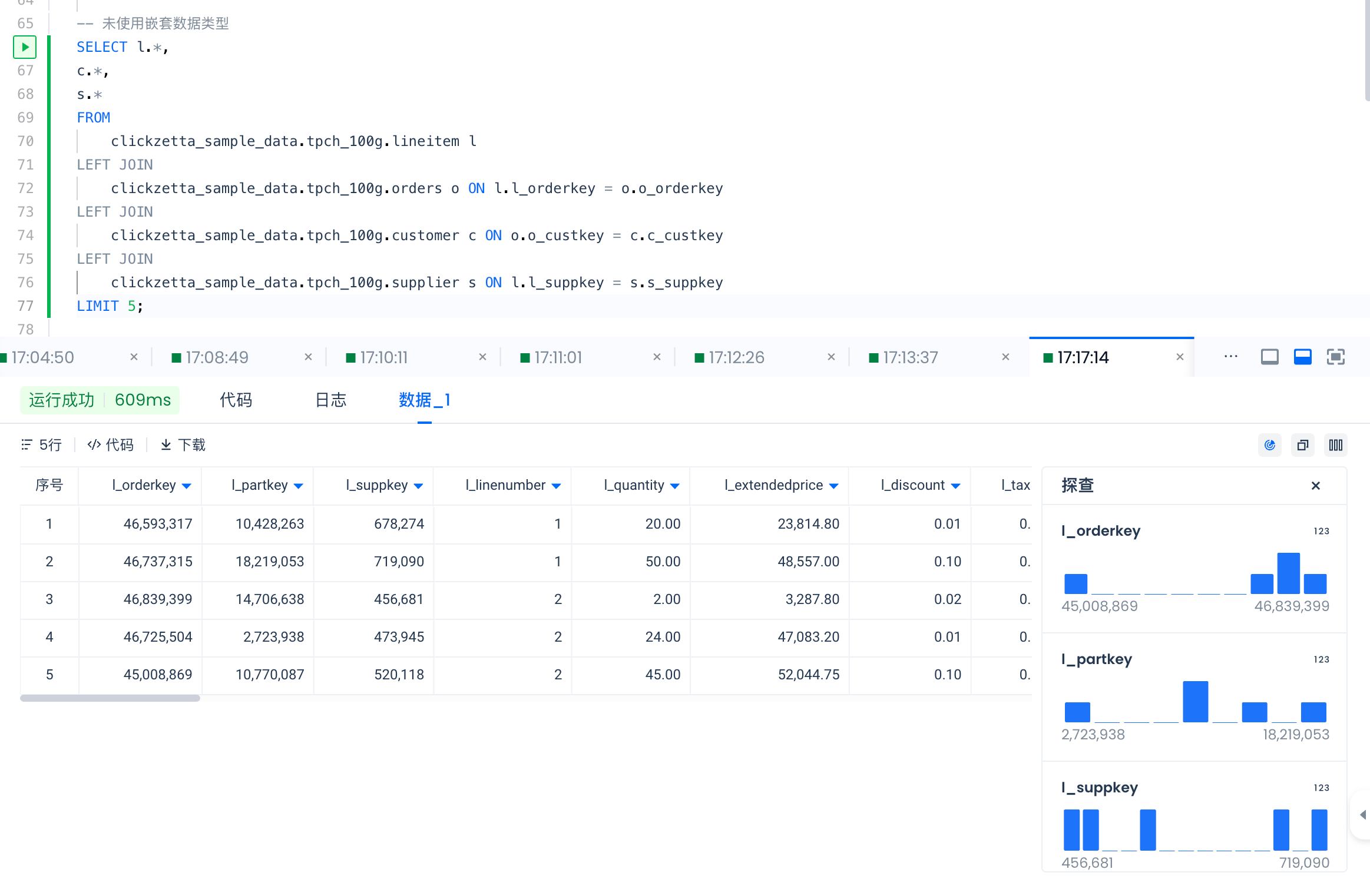 云器Lakehouse内置了共享的TPC-H数据,每个用户可以通过加上数据上下文直接使用,比如: