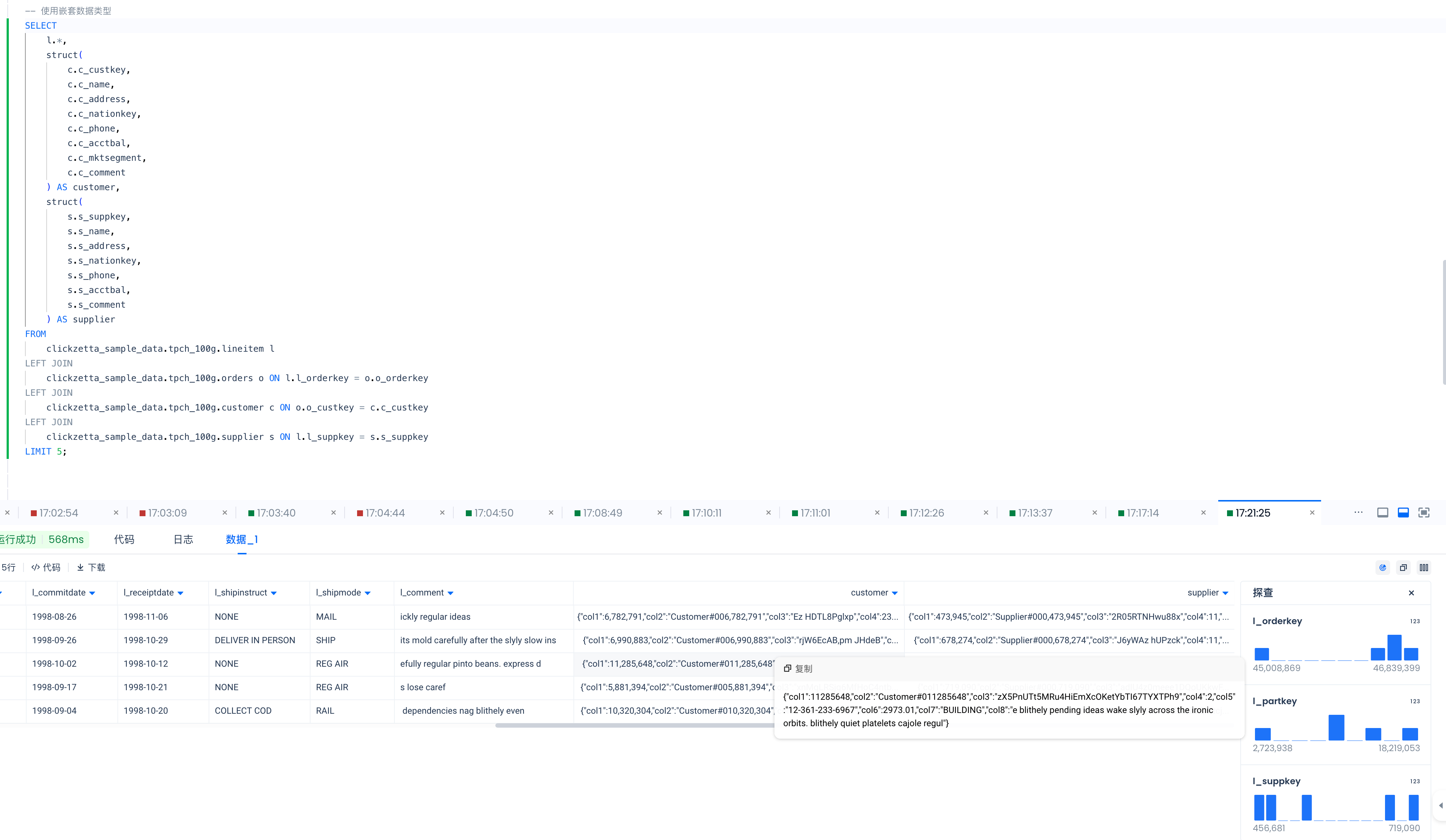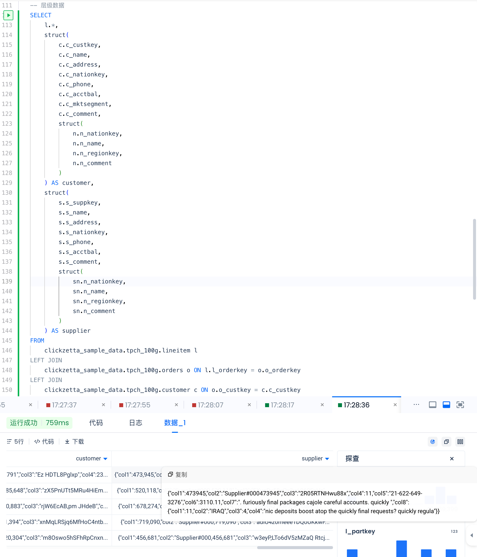 -- 层级数据 SELECT l.*, struct( c.c_custkey, c.c_name, c.c_address, c.c_nationkey, c.c_phone, c.c_acctbal, c.c_mktsegment, c.c_comment, struct( n.n_nationkey, n.n_name, n.n_regionkey, n.n_comment ) ) AS customer, struct( s.s_suppkey, s.s_name, s.s_address, s.s_nationkey, s.s_phone, s.s_acctbal, s.s_comment, struct( sn.n_nationkey, sn.n_name, sn.n_regionkey, sn.n_comment ) ) AS supplier FROM clickzetta_sample_data.tpch_100g.lineitem l LEFT JOIN clickzetta_sample_data.tpch_100g.orders o ON l.l_orderkey = o.o_orderkey LEFT JOIN clickzetta_sample_data.tpch_100g.customer c ON o.o_custkey = c.c_custkey LEFT JOIN clickzetta_sample_data.tpch_100g.nation n ON c.c_nationkey = n.n_nationkey LEFT JOIN clickzetta_sample_data.tpch_100g.supplier s ON l.l_suppkey = s.s_suppkey LEFT JOIN clickzetta_sample_data.tpch_100g.nation sn ON s.s_nationkey = sn.n_nationkey LIMIT 5;