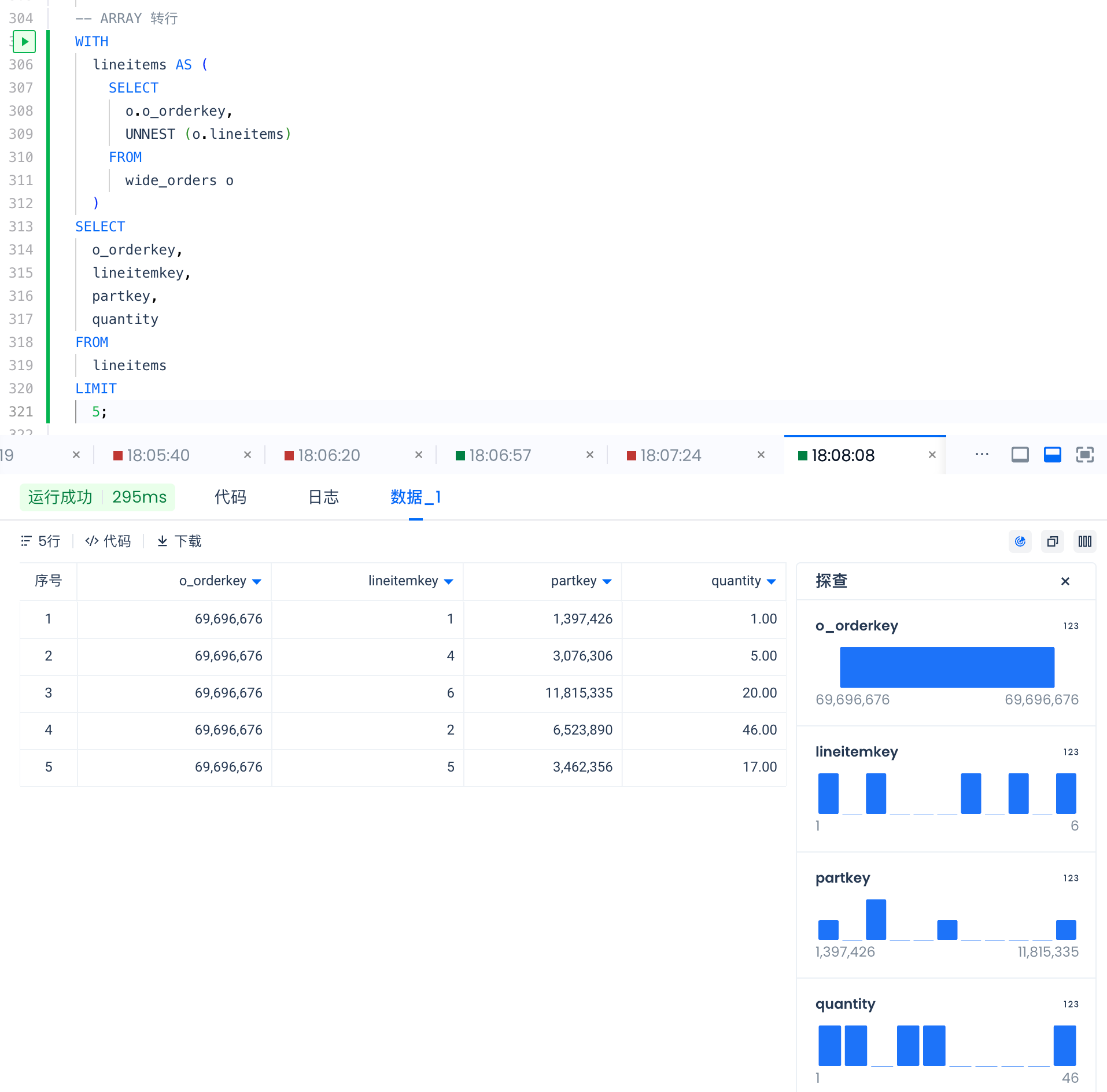 -- ARRAY 转行 WITH lineitems AS ( SELECT o.o_orderkey, UNNEST (o.lineitems) FROM wide_orders o ) SELECT o_orderkey, lineitemkey, partkey, quantity FROM lineitems LIMIT 5;