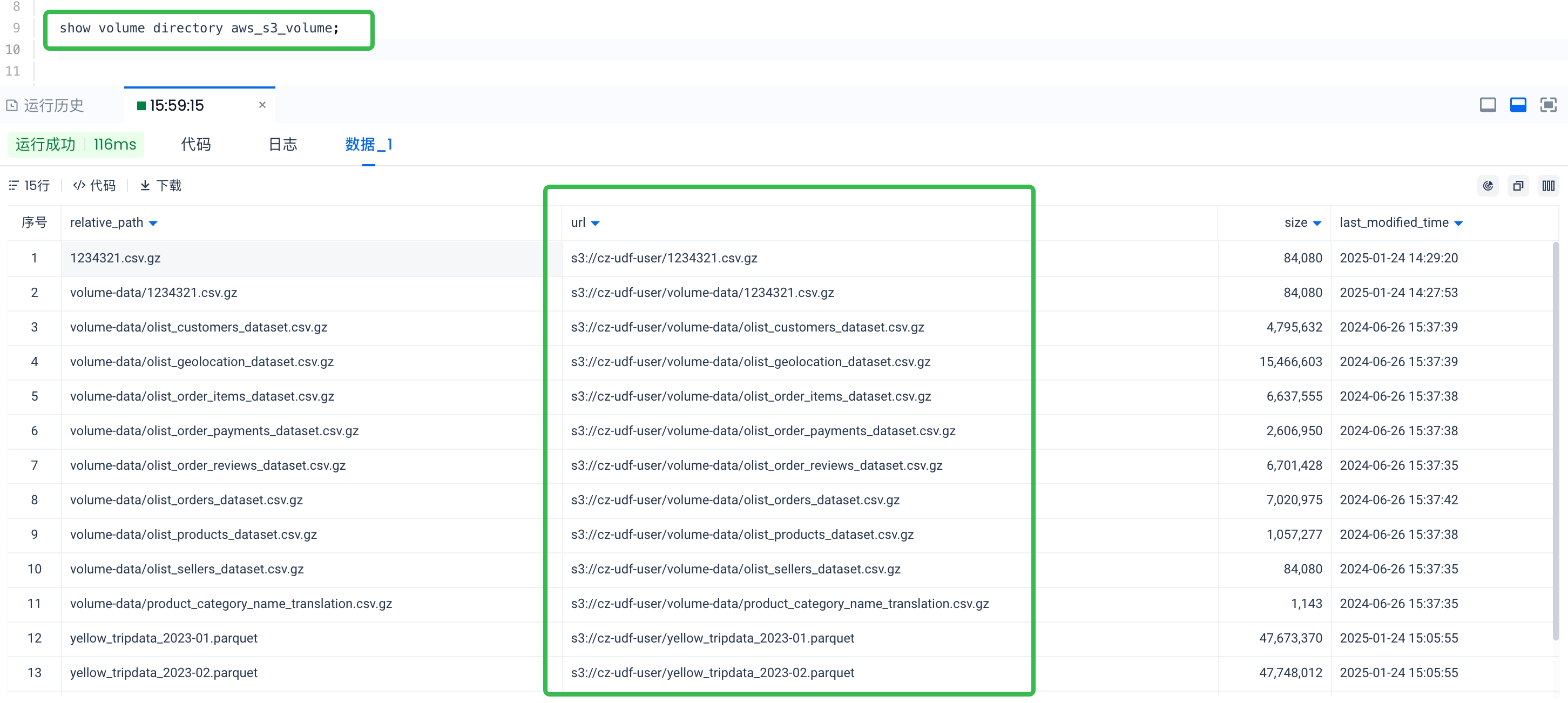 :支持使用正则表达式匹配文件。需要注意的是,正则表达式匹配的目标是文件的完整的对象存储路径(如 's3://cz-udf-user/volume-data/1234321.csv.gz'),而不是以文件在 Volume 对象的相对路径。