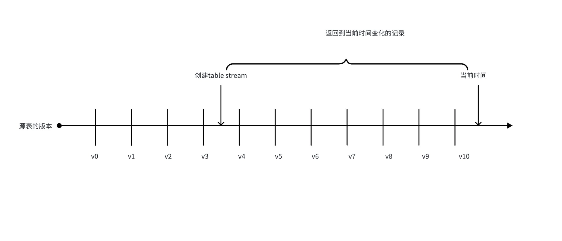 上面的例子显示了一个源表在时间线上有10个已提交的版本。Table Stream的偏移目前在表版本v3和v4之间。当查询(或消费)流时,返回的记录包括从表版本v4开始,即表时间线中流偏移之后的版本,到v10结束,即时间线中最近提交的表版本,包括这两个版本之间的最小更改集。