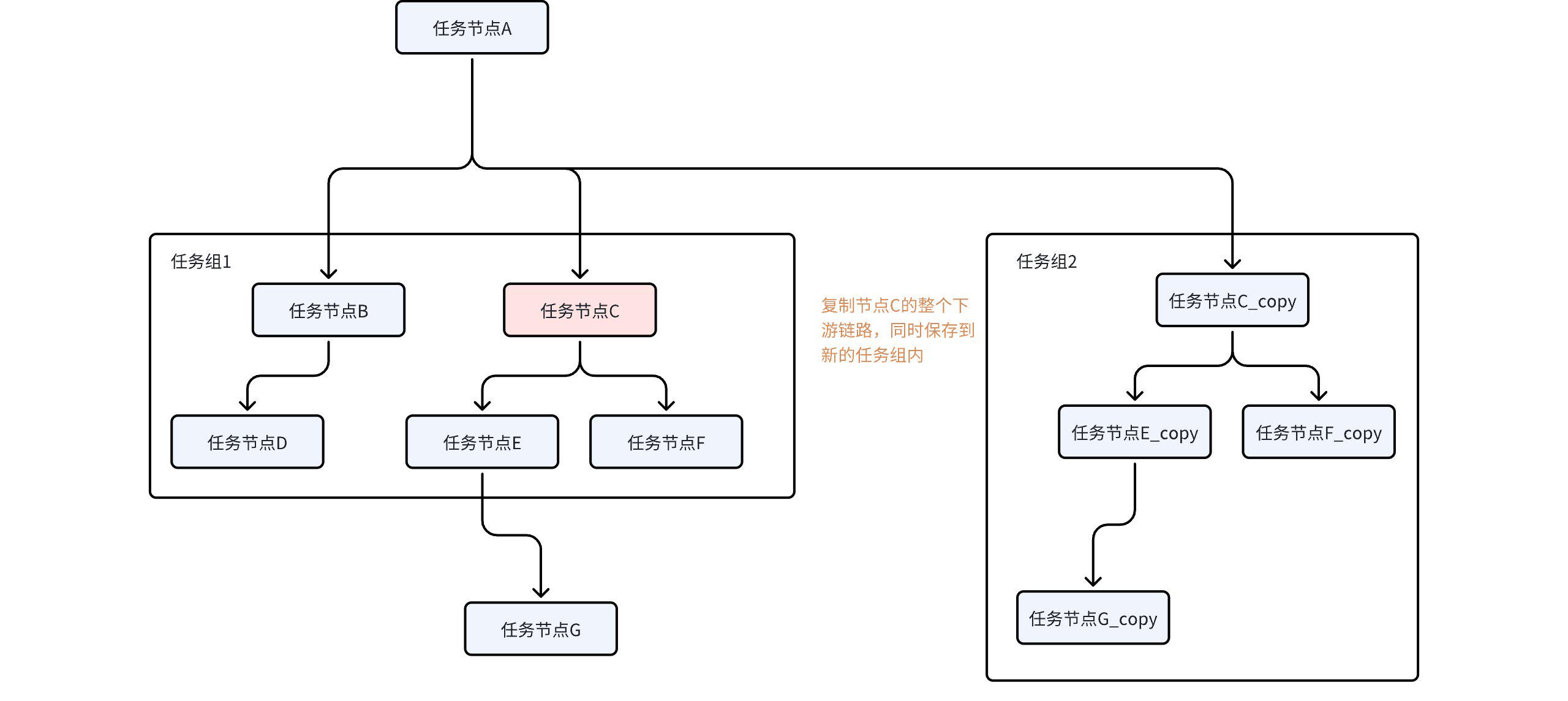 在任意一个节点上(该节点可以是归属于某一个任务组,也可以是独立的),点击「下游链路复制」时,会将该节点及其下游所有节点进行批量复制。