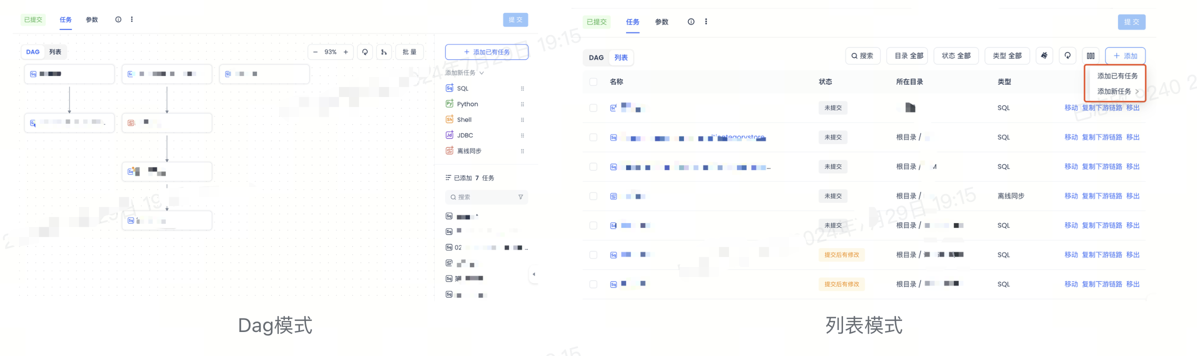 - 添加已有任务:点击右侧「添加已有任务」后,可将列表中的任务拖至DAG画布区域;