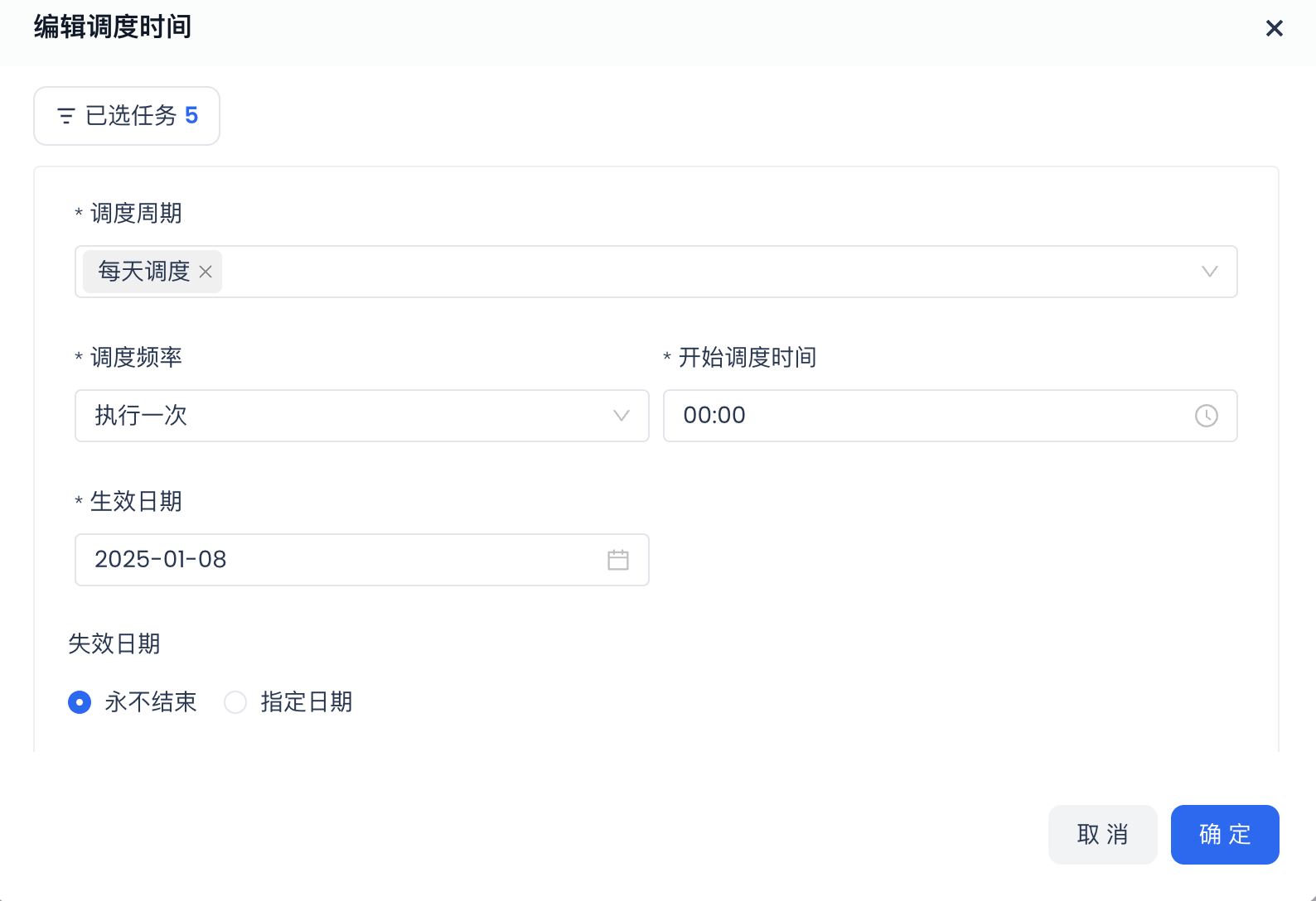 选择批量修改的调度时间,这里操作同任务调度里的调度配置,具体操作可参考任务开发调度