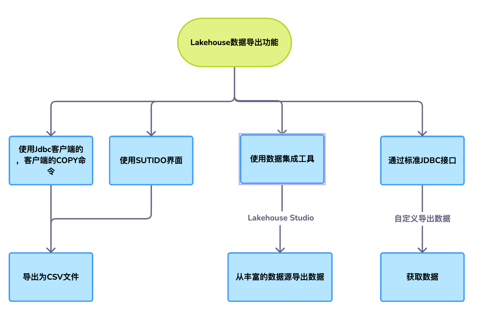 Lakehouse大数据计算引擎提供了灵活的数据导出功能,允许用户将数据导出为CSV文件格式,便于在本地或其他数据分析平台中使用同时也支持使用数据集成工具,数据集成工具支持了丰富的数据源比如MySQL、PostgreSQL、HIVE、TIDB、StarRocks
