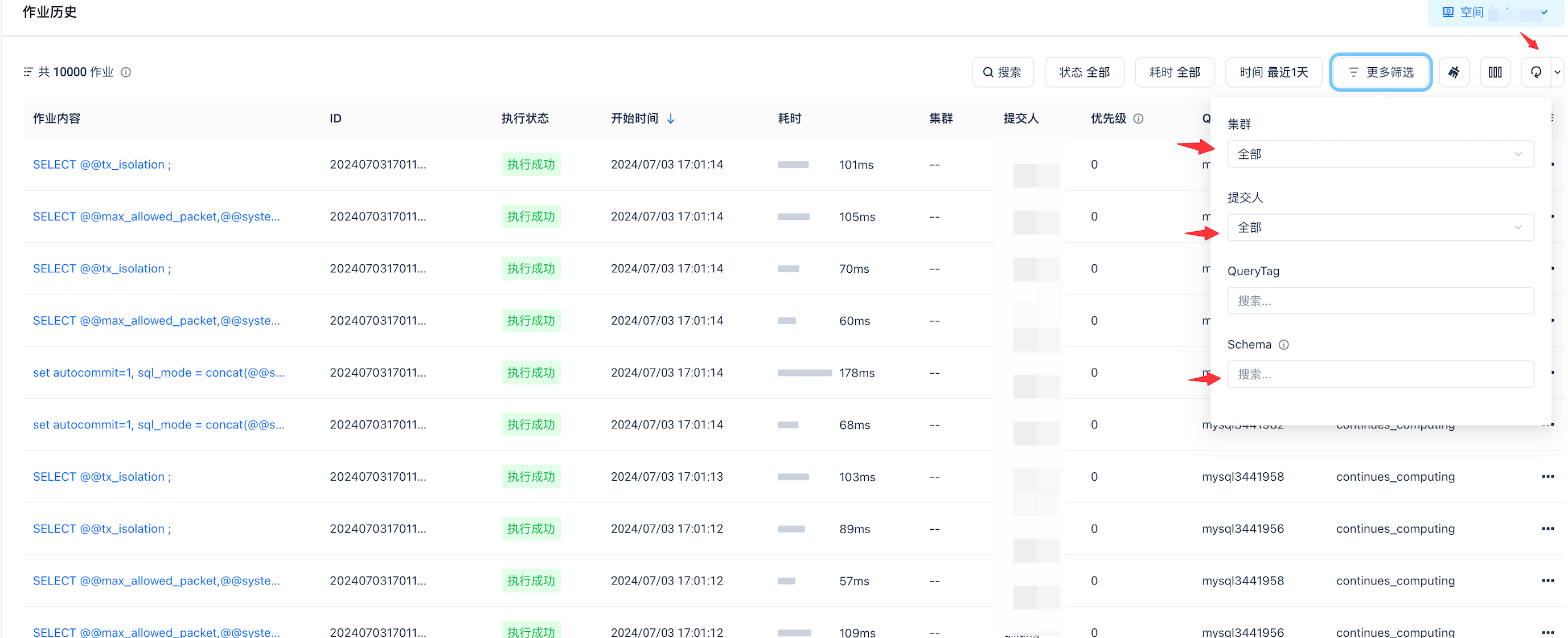 通过lakehouse作业历史排查问题。如果mysql协议连通之后,mysql连接Lakehouse通常会发一些SQL,作业历史会记录发送的SQL,此时我们可以通过作业历史查看发送的SQL来看错误信息。通过筛选来快速定位,如下三个筛选条件