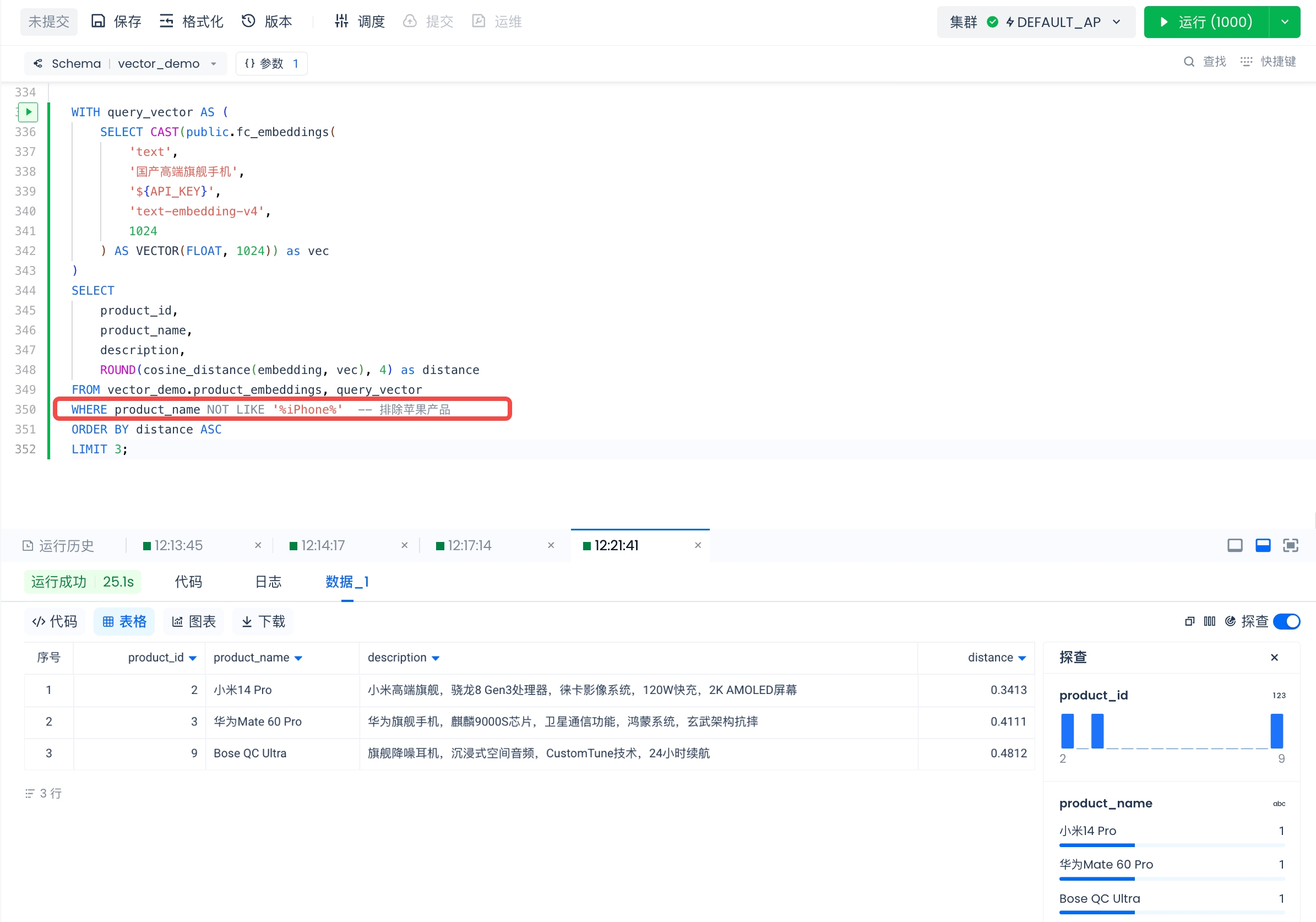 SELECT id, doc, l2_distance(vec, vector(1,2,3,4)) as dist FROM some_table WHERE match_regexp(doc, '.*hello.*', map('analyzer', 'keyword')) AND l2_distance(vec, vector(1,2,3,4)) < 1000 ORDER BY dist LIMIT 100