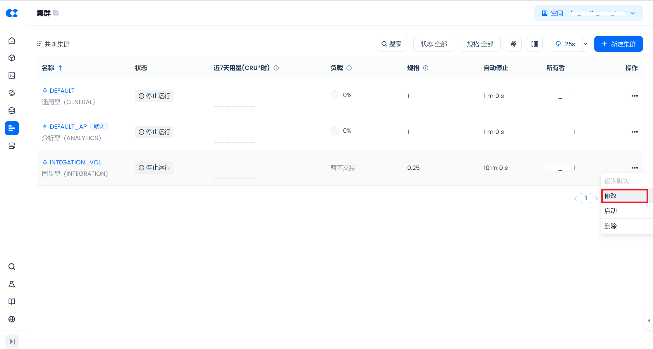 在集群列表中,选择相应集群,点击“操作”列的“修改”按钮,即可对集群配置进行调整。修改后的集群配置可能影响集群状态,请注意在修改规格、实例数等关键属性时,确保集群上没有正在运行的作业。