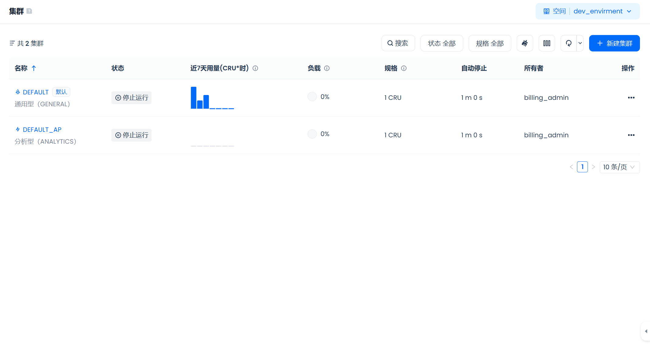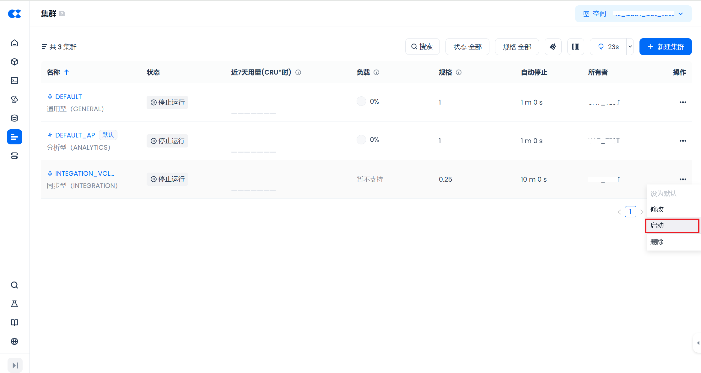在集群列表中,点击“操作”列的“启动”或“停止”按钮,即可对计算集群进行启动或停止操作。请注意,停止集群时,正在执行的作业将等待完成后集群才会停止。