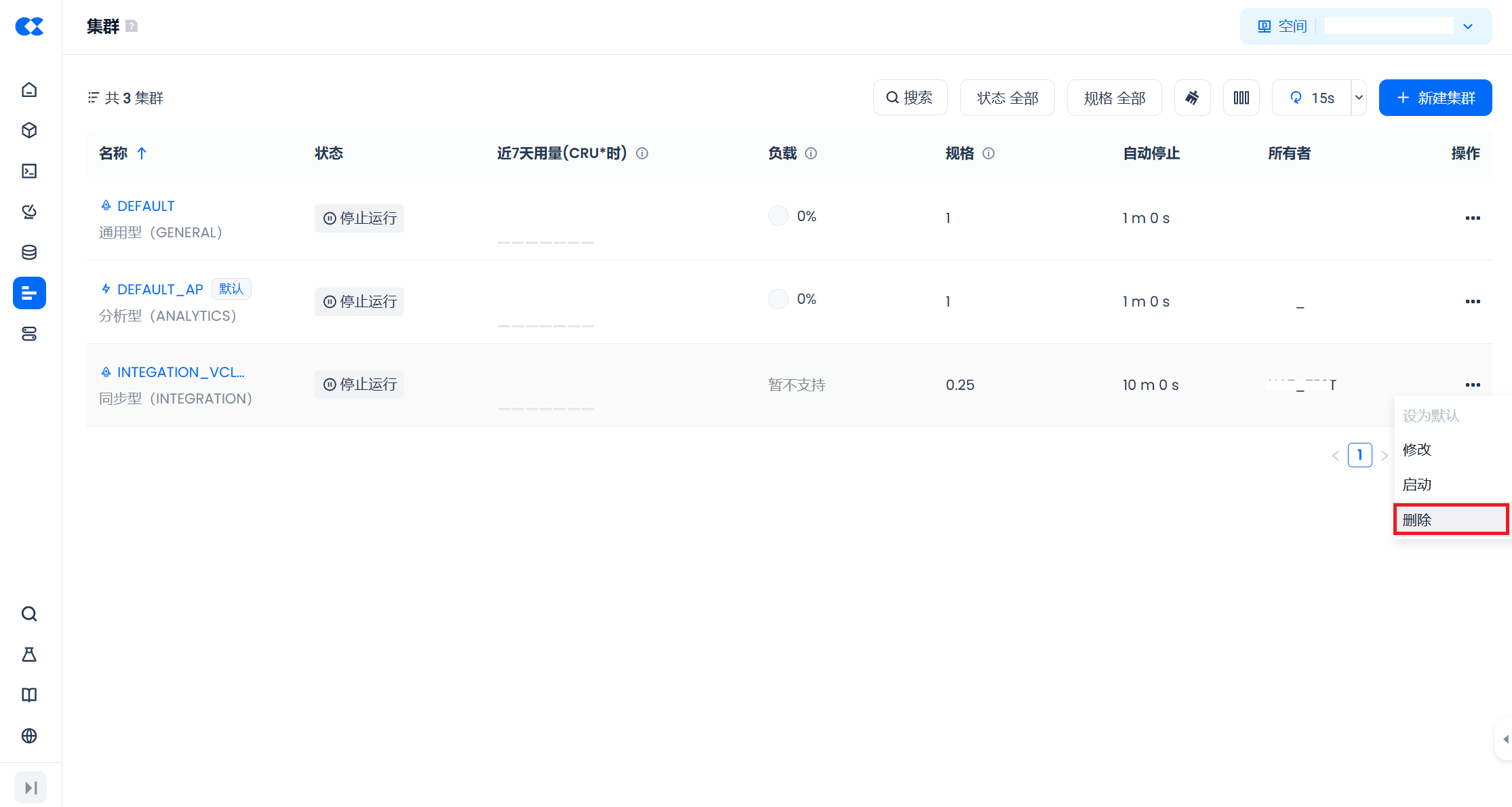 在集群列表中,点击“操作”列的“删除”按钮,即可删除指定的计算集群。删除集群前,需要先停止集群,并等待所有作业完成后才能完成删除操作。
