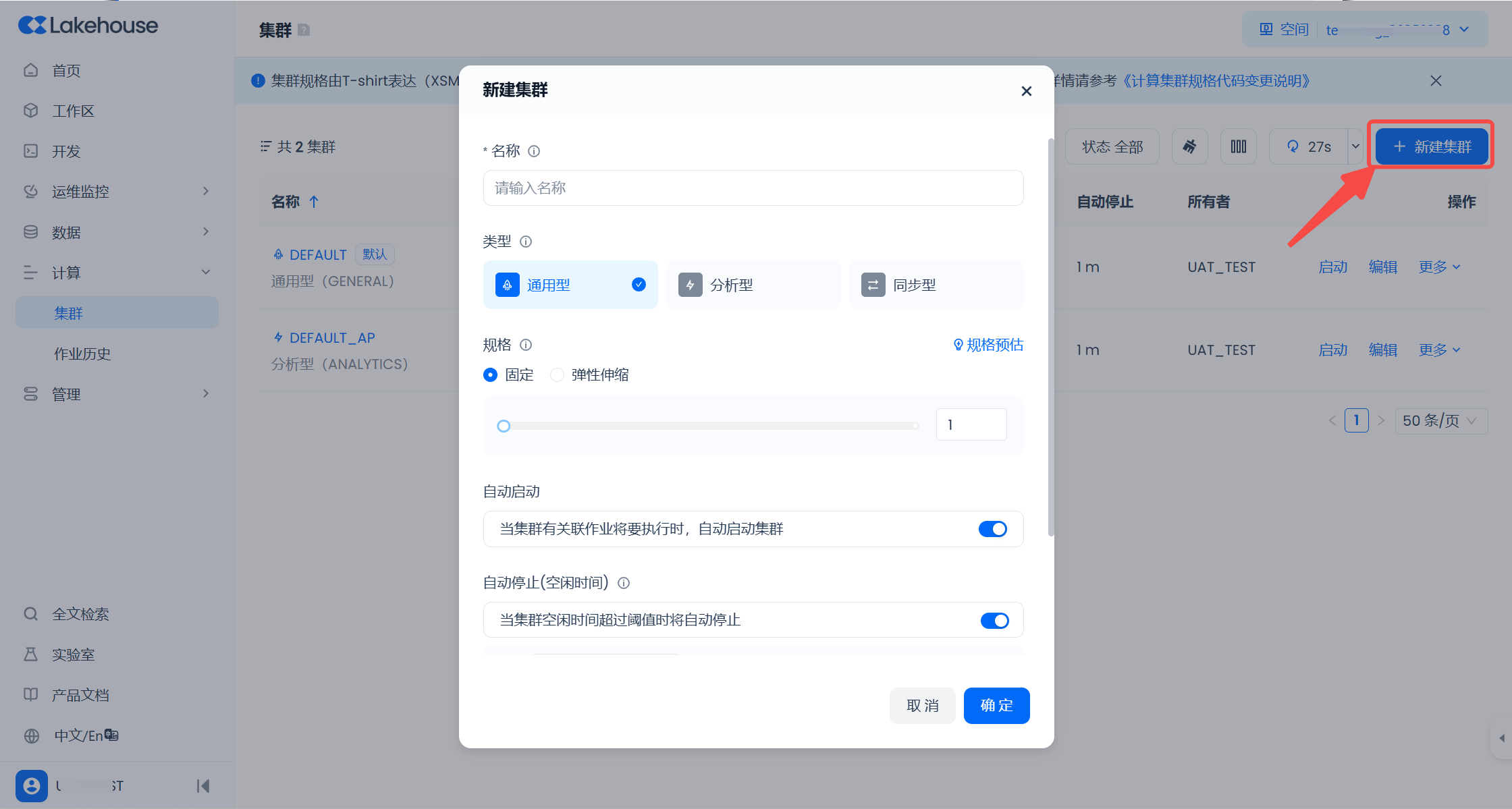 登录Lakehouse平台,点击左侧菜单的“计算”功能,进入“计算集群”列表页面。在此页面,您可以查看当前工作空间内所有授权访问的计算集群。