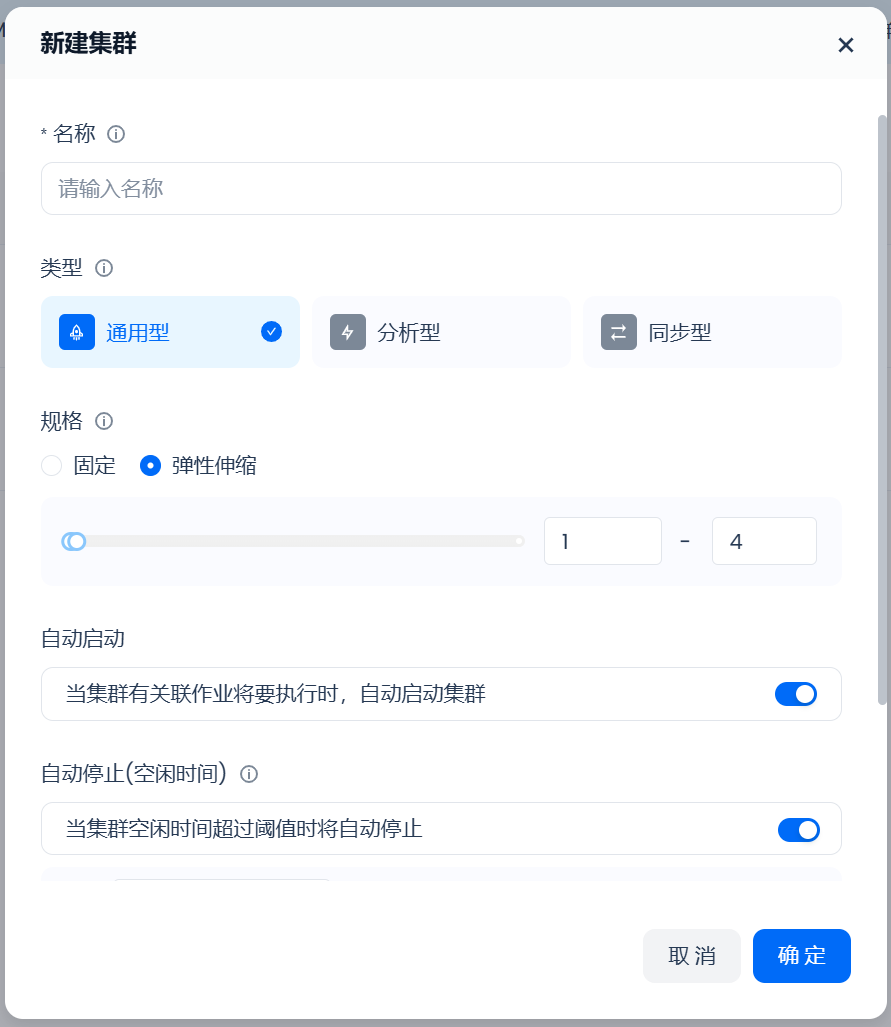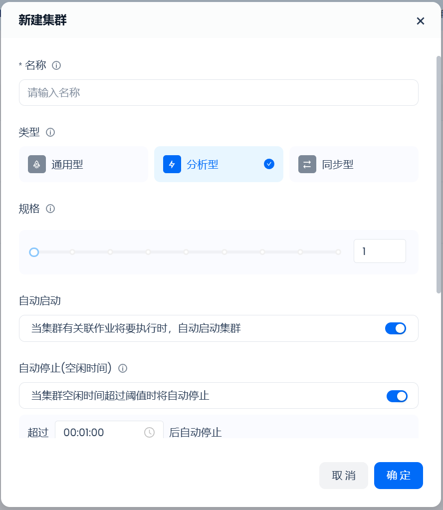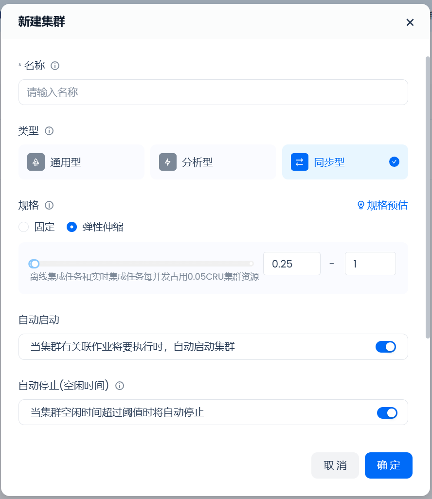 如果需要处理离线或实时集成任务,需要创建同步型集群: