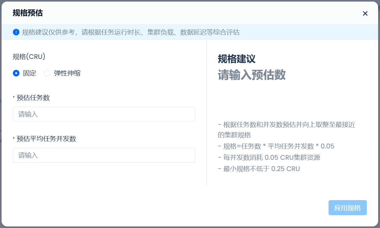 - 同步型计算集群提供了“规格预估”功能,辅助选择合适的同步型集群规格。可通过输入“任务数”和“平均任务并发数”,按照“规格=任务数 * 平均任务并发数 * 0.05”的公式计算出预估的集群规格。