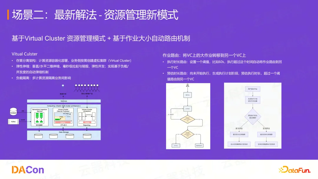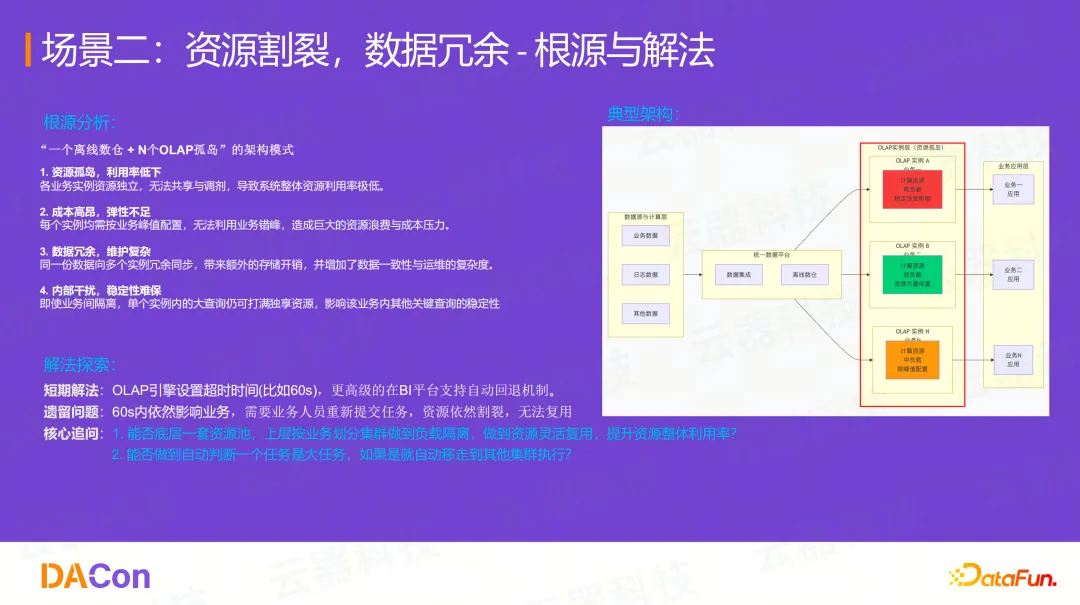 | 场景二:资源割裂,数据冗余 | "1+N" OLAP孤岛,利用率低,稳定性差。 | 高性能引擎 + 资源管理新模式 (VC) |