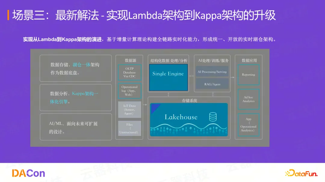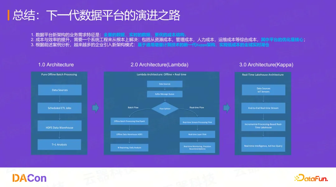- 3.0 架构 (Kappa): 端到端的实时流处理,基于增量计算的实时湖仓。