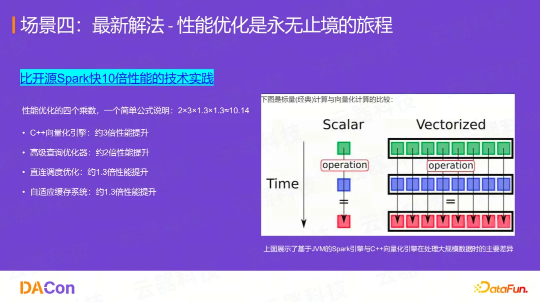 云器科技的引擎在标准TPC-H测试上能做到比开源Spark快10倍。这不是单一技术实现的,而是多个优化项的乘积效应: