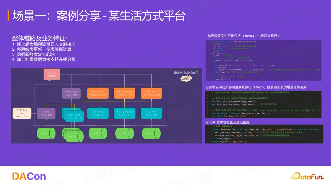 业务特征: 超大规模流量日志实时接入、多源维表更新、多表关联计算、数据新鲜度要求5分钟以内,且加工结果数据直接支持在线分析。