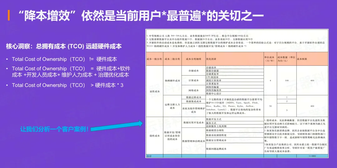 在一个真实的客户案例中,一个百台规模的平台,其物理硬件成本可能只占总成本的不到30%。而基于众多开源组件(如HDFS、Spark、Flink、Hive等)进行自建和的运维支撑所投入的成本,加起来远远超过了硬件本身。