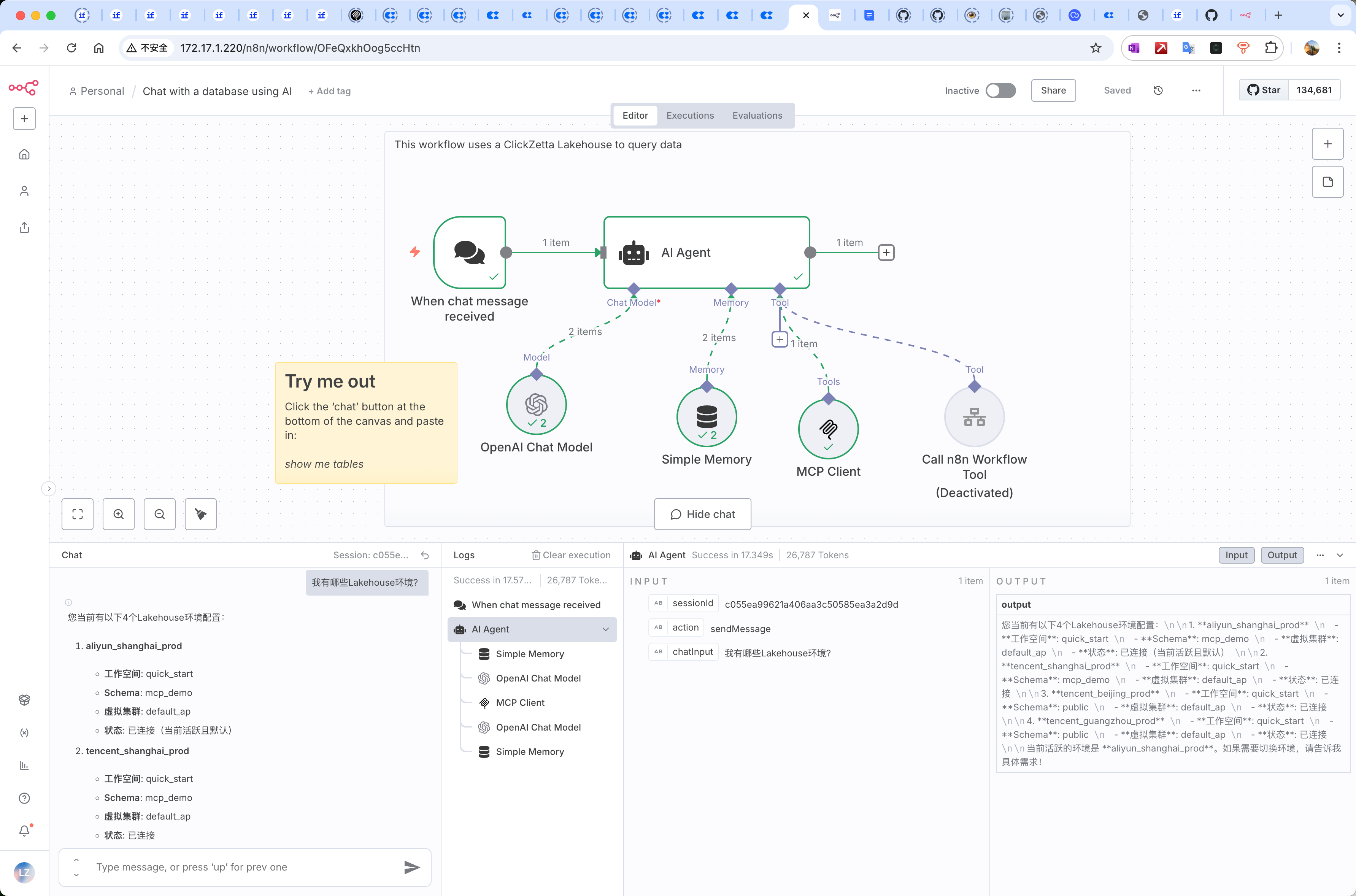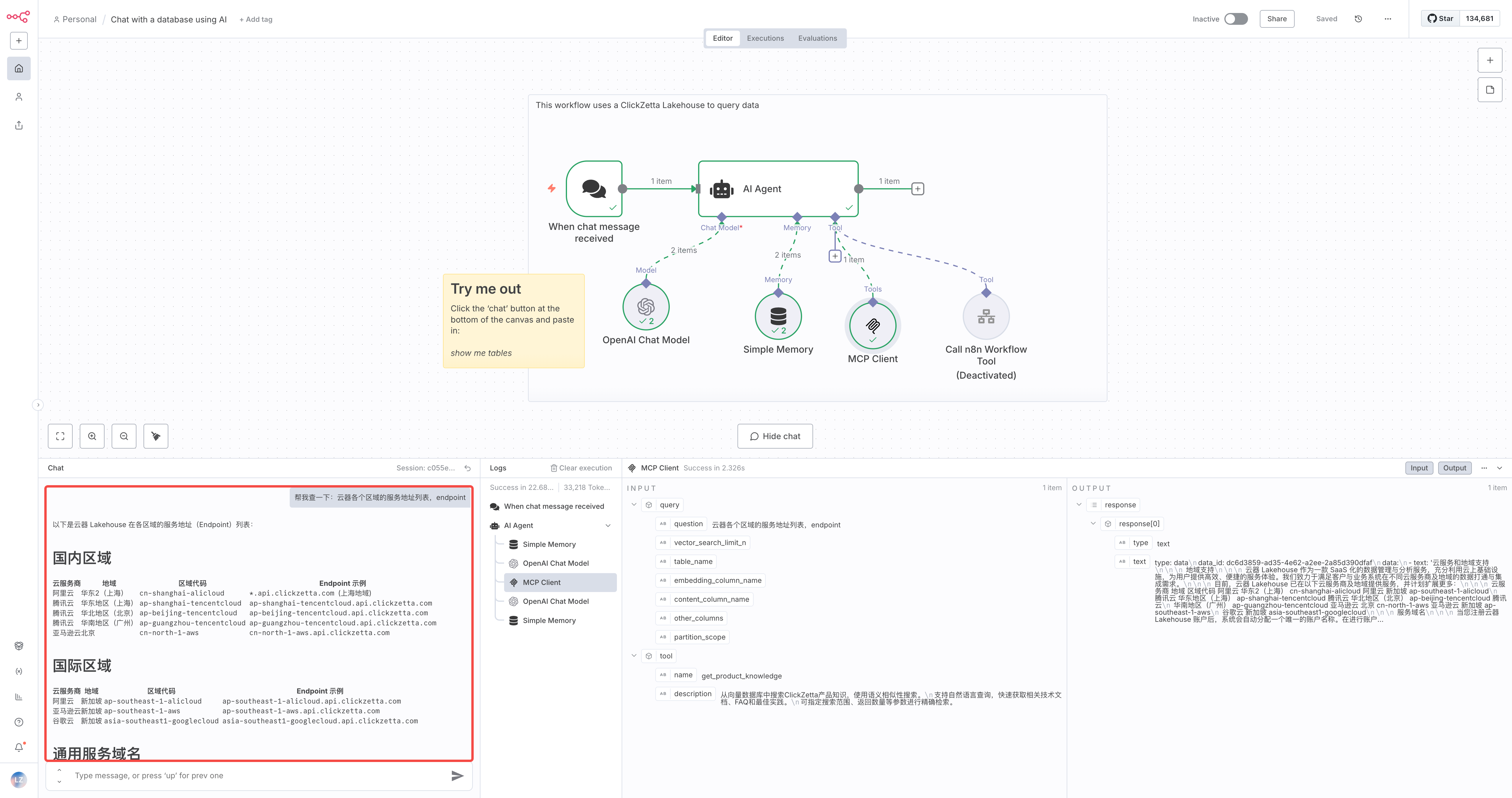 Lakehouse MCP Server通过这种方式实现和N8N的集成,来自Lakehouse MCP Server的丰富的工具可以在N8N 的 Agent 节点中轻松调起来。