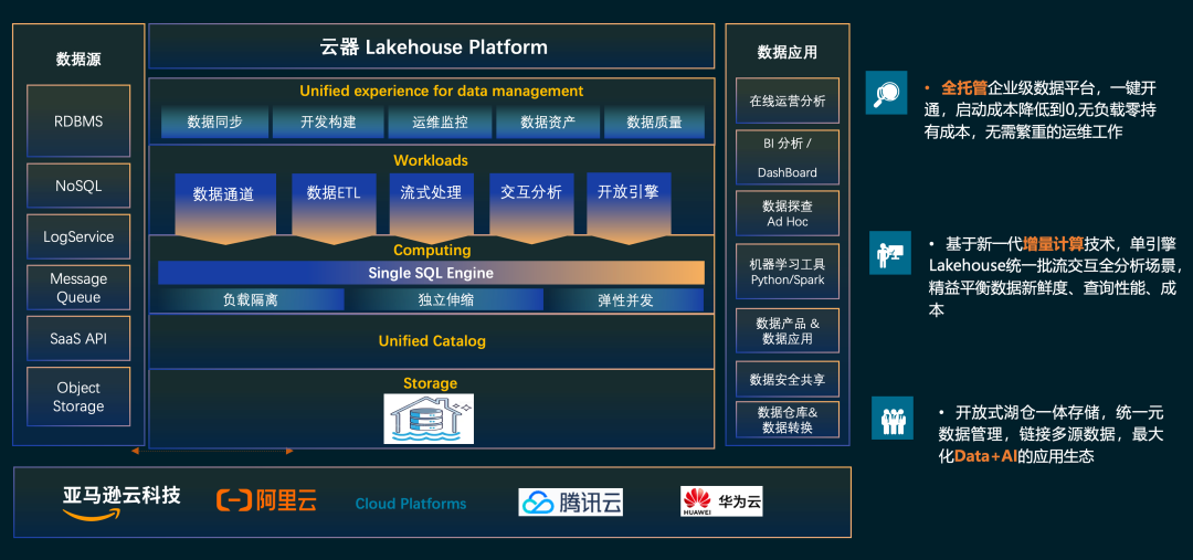 云器Lakehouse的"Single-Engine"一体化架构,无需拼装多个开源组件,在一个引擎内实现批、流、交互的统一,简化了数据架构,降低了系统复杂度,让数据开发和分析和运维效率大幅提升;全新的增量计算技术,通过存储和计算侧提供增量数据处理能力,突破了传统批量计算引擎处理流式数据的性能瓶颈,相比流计算引擎近实时ETL效率提升高达100倍;存储计算分离的云原生架构,采用Shared-Everything的设计理念,支持存储和计算的独立弹性伸缩,能够轻松应对复杂多变的业务负载,支持秒级计算资源伸缩和纵横双唯独的弹性伸缩能力,使用户可以充分享受云的弹性和经济性。