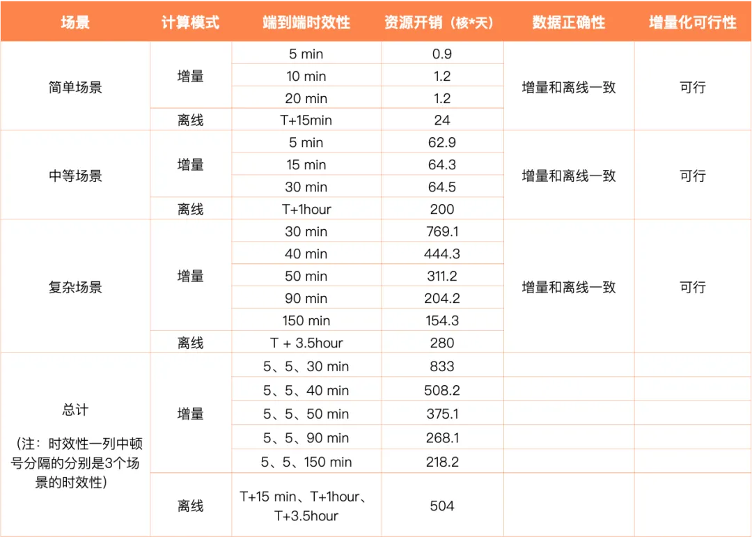 - 上述结果中增量计算资源开销是每天所有单次增量累加所得,如简单场景5分钟时效性时,每5分钟做一次增量计算,每天做24*60/5 = 288次计算所耗资源相加所得;离线资源开销是单次全量计算所用资源。