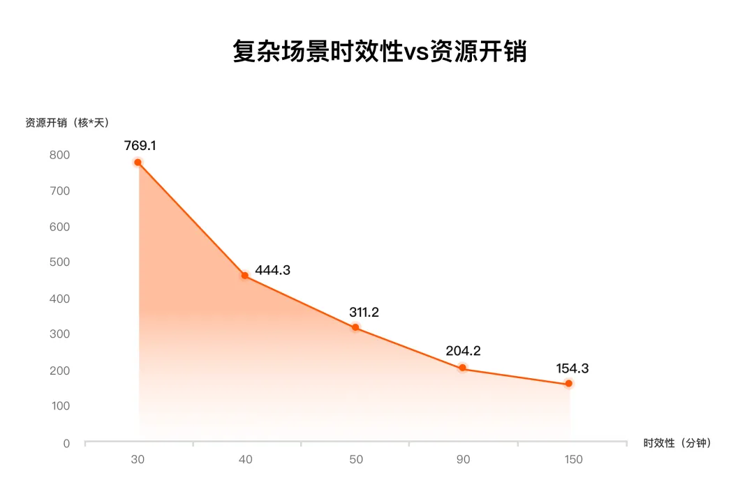 本次测试中“超大数据量+计算复杂”的复杂场景测试结果体现了资源开销和时效性呈现反比关系,资源开销随着时效性下降也显著减少。结果如下图: