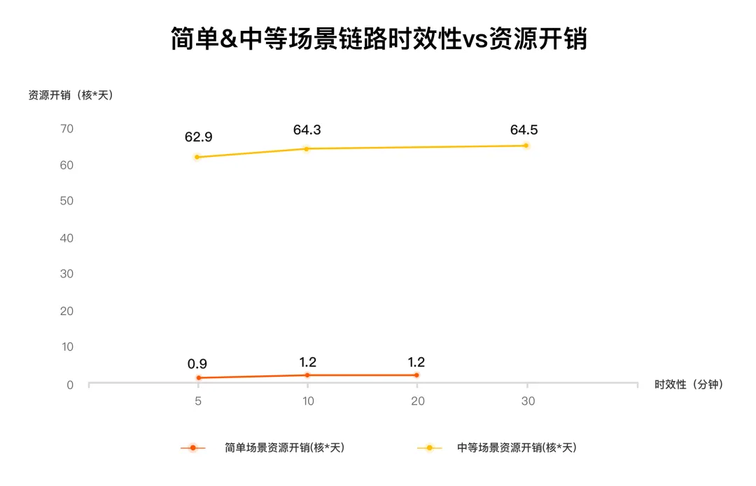 本次测试中另外两个主流场景 - 简单和中等场景,由于计算逻辑非常简单,数据仅做简单的插入操作,资源开销和时效性呈现简化的常数关系,即资源开销不再随着时效性提升而增加,保持比较固定的值。