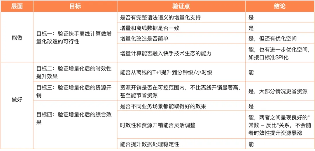 本次探索和实践经过全面的测试和验证,能比较充分地回答最初定下的离线改增量“能做->做好”两个层面多个目标下的验证点,结论如下: