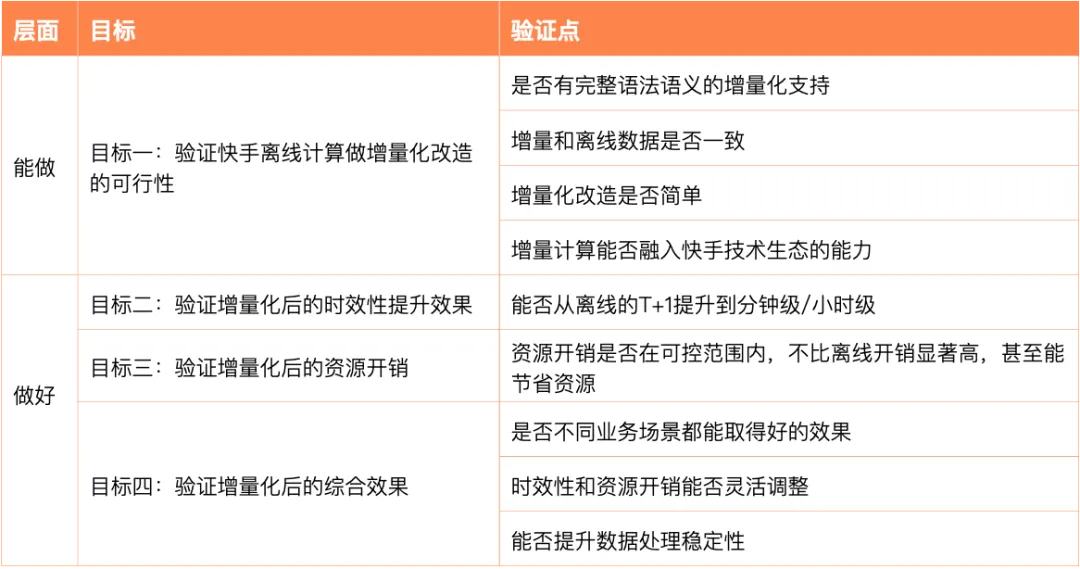 - 目标一: 验证在快手复杂生产场景下离线计算做增量化改造的可行性,属于“能做”层面;