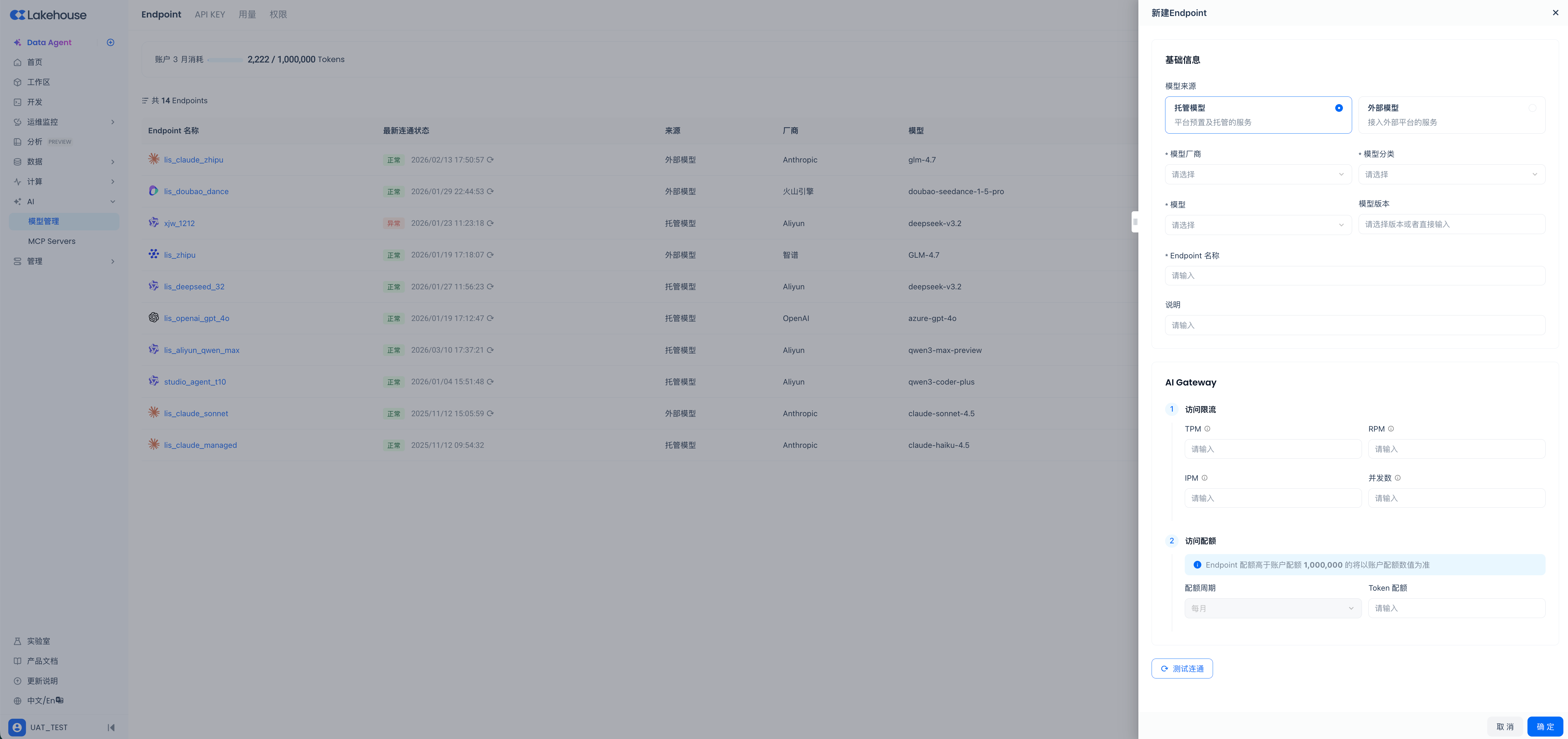 - 进入「模型管理 → Endpoint」页面,系统默认展示租户内已配置的托管模型列表;