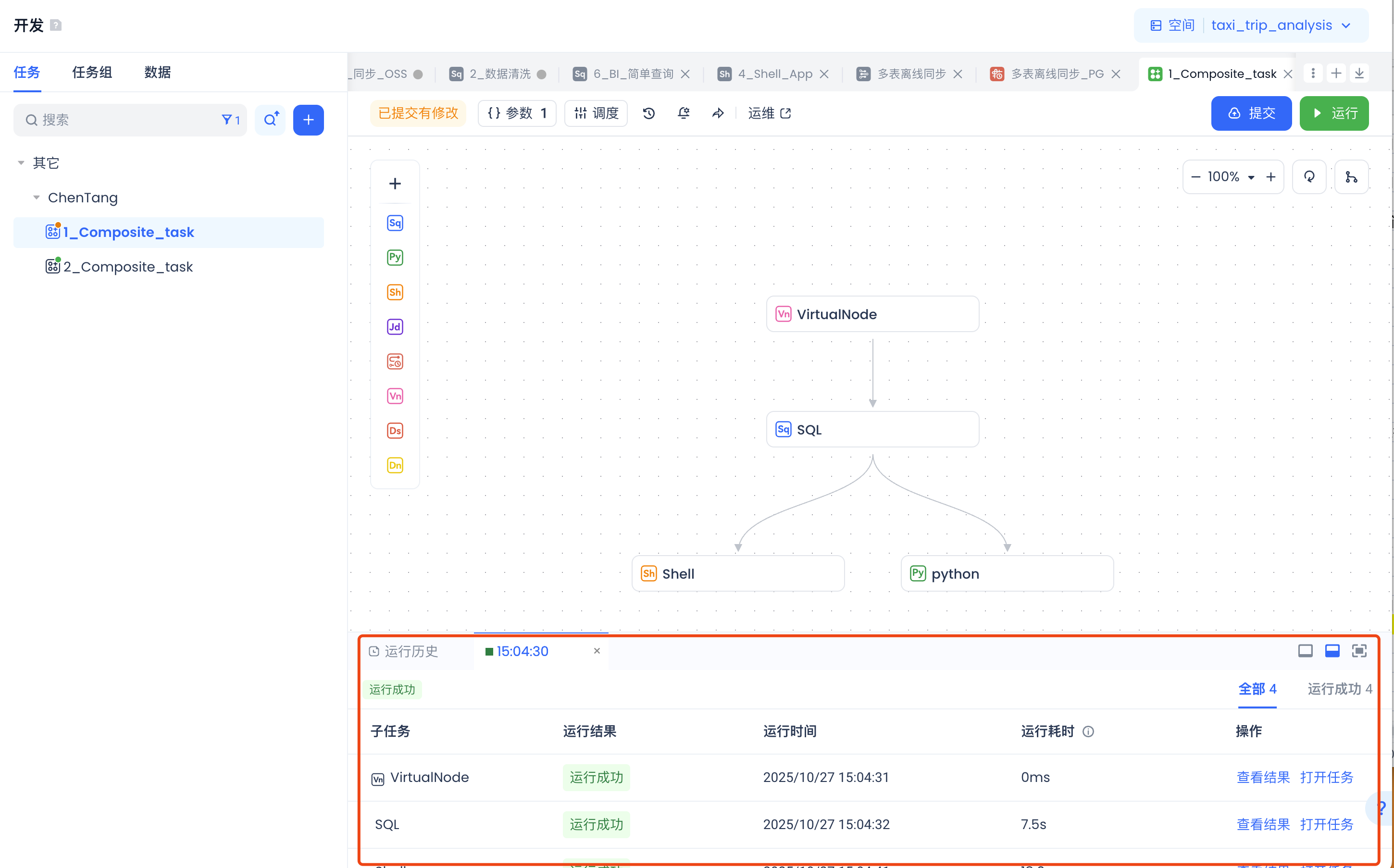 任务开发:组合任务支持手动触发临时运行,提供提交发布到生产环境调度运行前的测试能力。