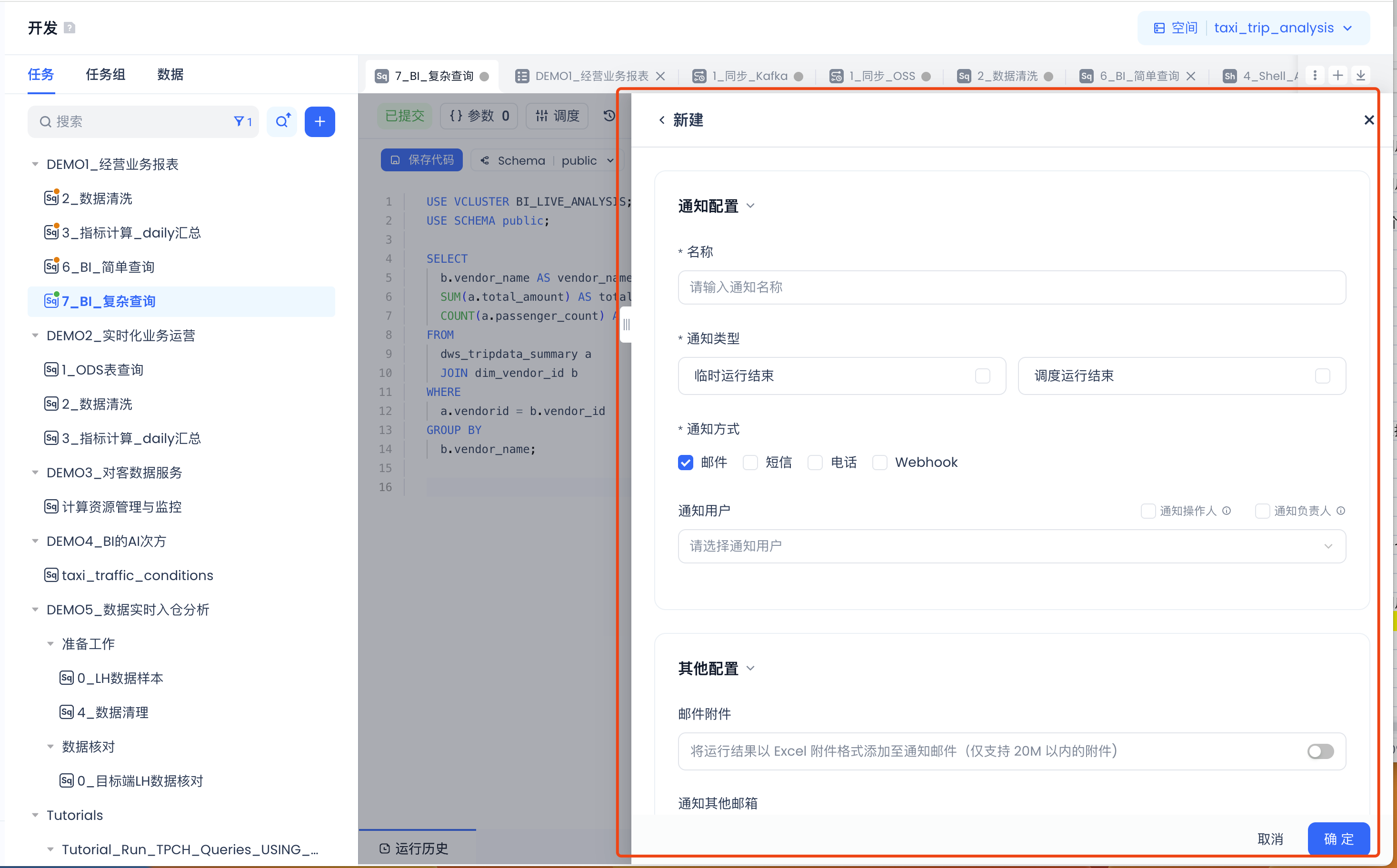 任务开发:新增任务ad-hoc运行完成和周期调度完成后的监控通知功能,支持以邮件方式发送数据查询结果。