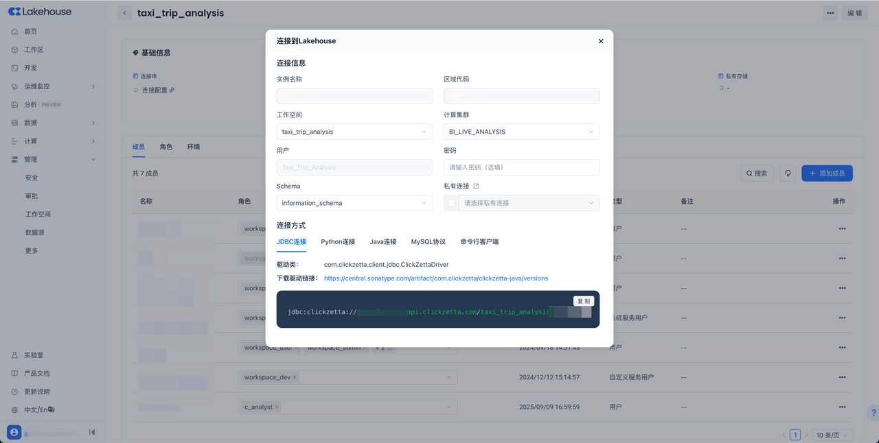 工作空间:工作空间连接串信息展示优化。新增支持根据所选登录身份和资源,生成JDBC、MySQL协议连接串,以及Java、Python等连接示例代码。