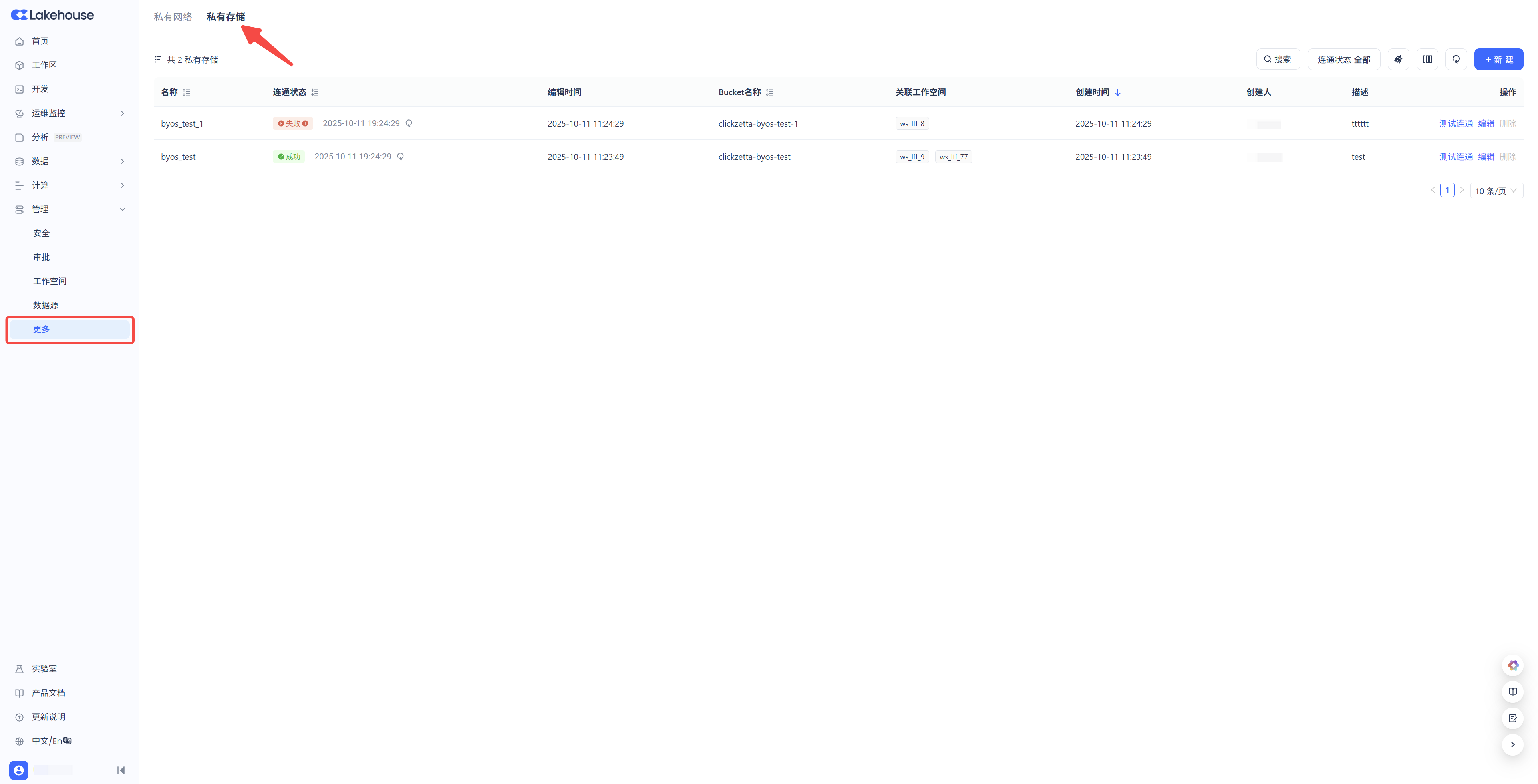 创建完成后,私有存储的默认连通状态为“失败”,需要点击私有存储右侧的“测试联通”按钮,测试私有存储的连通性。Lakehouse测试连通性时将进行的操作是:使用Lakehouse在云平台的账号调用同云平台同region的HeadBucket/GetBucketInfo等相似功能的接口,确认: