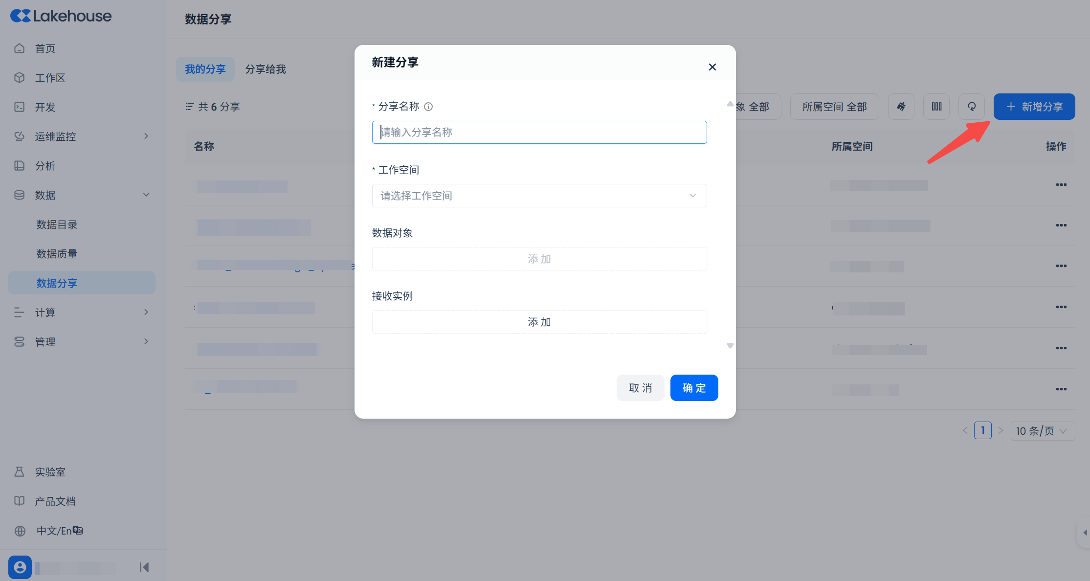 - 左侧导航选择"数据管理" → "数据分享",点击"+新增分享"