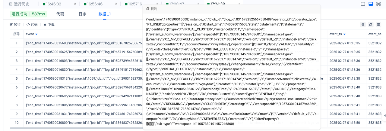 调整 select 语句,使用 parse_json 将 value 字段和其中的 event 展开: