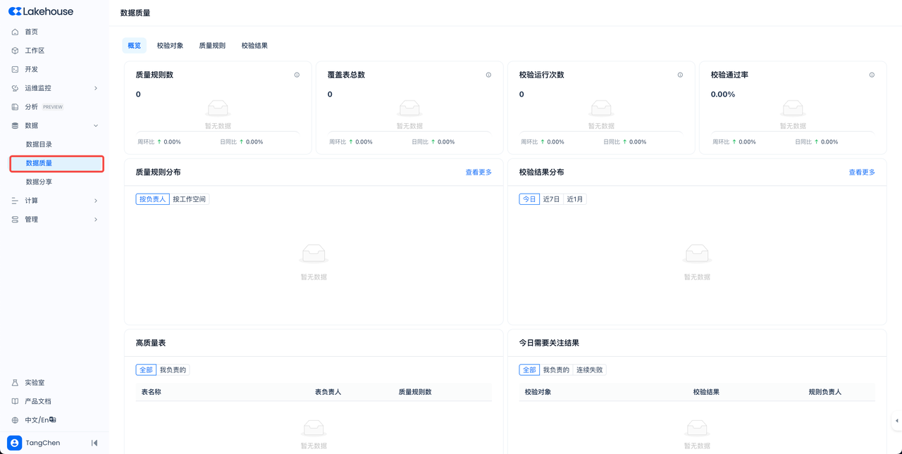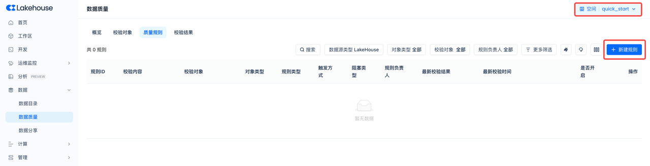 工作空间管理员角色(workspace_admin)或者工作空间开发角色(workspace_dev)的用户,有权限使用「数据质量」功能。 - 「数据质量」功能目前主要用于监控Lakehouse的数据对象,比如Table、View、Volume、Dynamic Table等,对于MySQL等其它数据类型,暂不支持。
