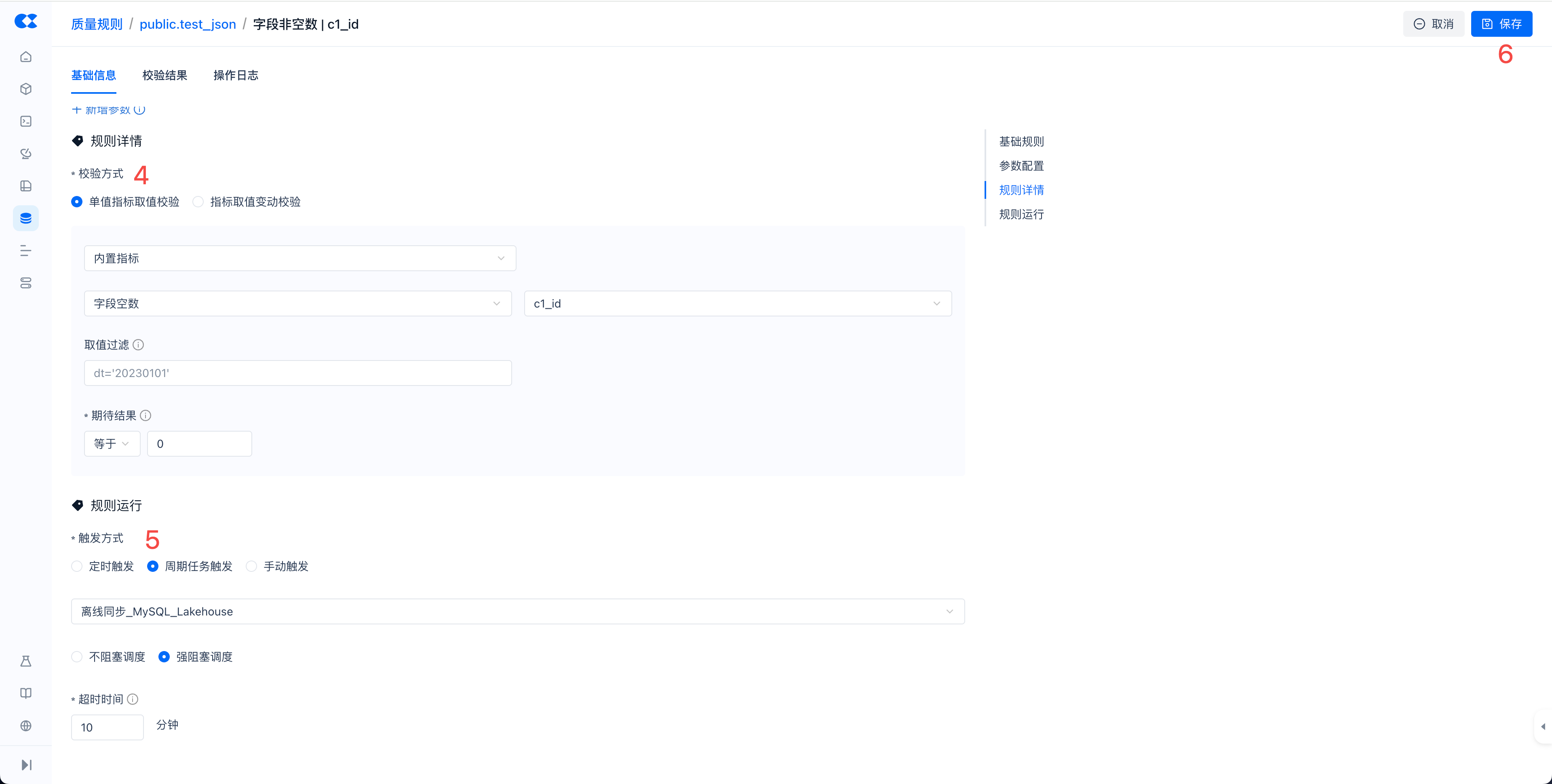其它配置项保留默认值/留空即可。最后点击“保存”【6】按钮,完成质量规则的新建。
