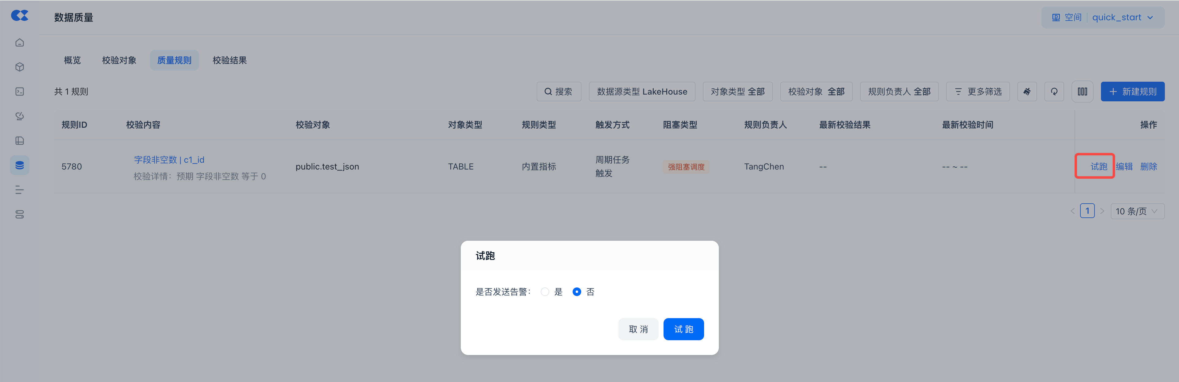 可以点击“试跑”按钮来测试质量规则的配合和校验情况,在“校验结果”Tab可以查看具体结果,如下图所示,质量规则被触发运行、校验结果和预期一致、一切正常,校验符合预期。