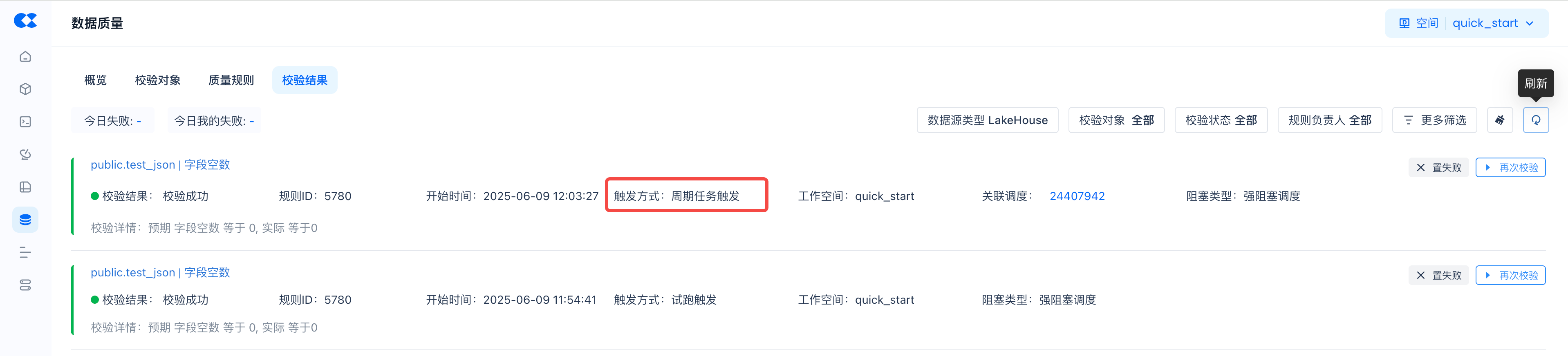 在「数据质量」的“校验结果”中,可以看到新增的校验记录,触发方式为“周期任务触发”。