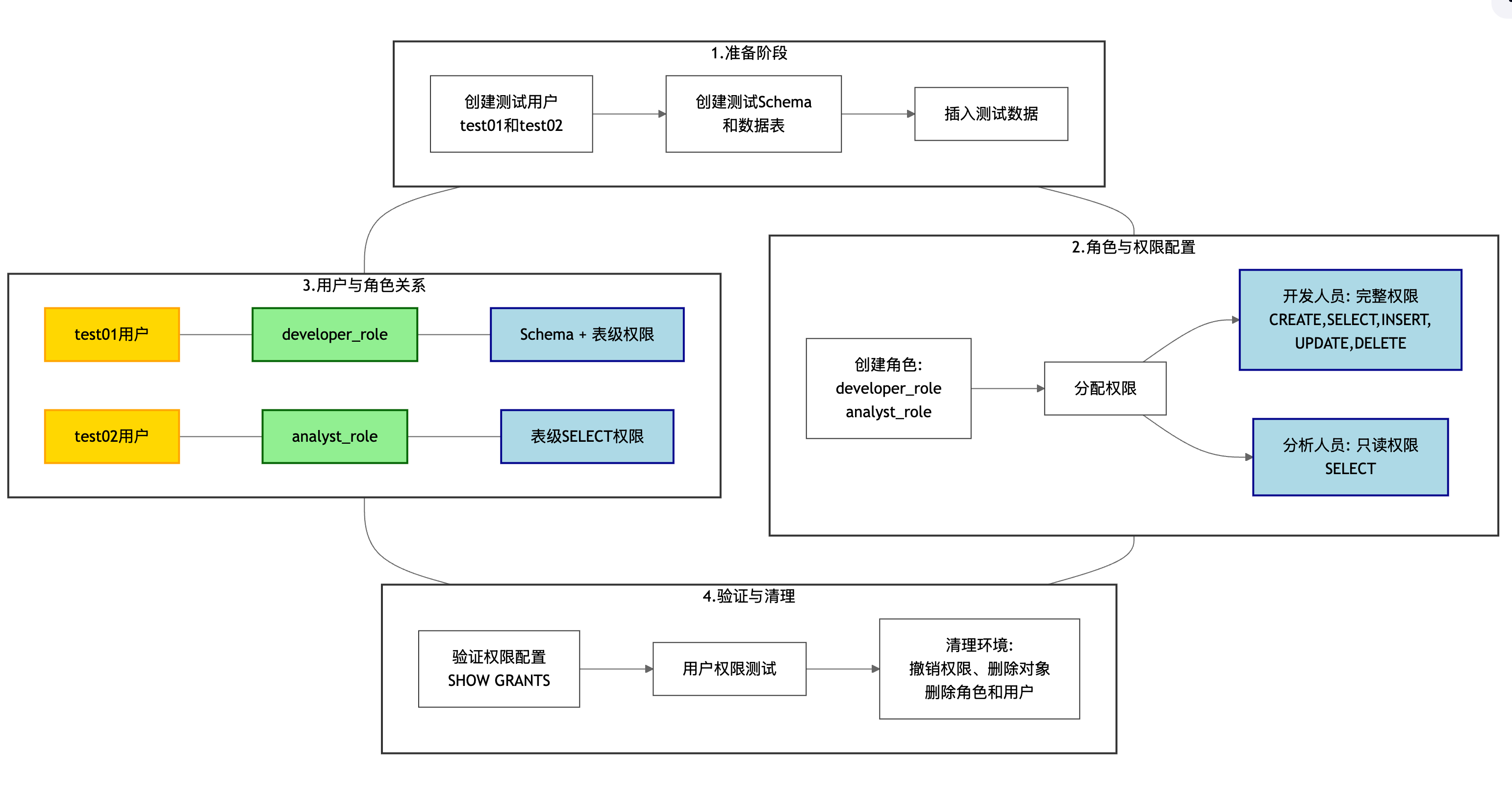 以下是一个完整的用户授权管理实践案例,从创建用户到清理环境的全流程:
