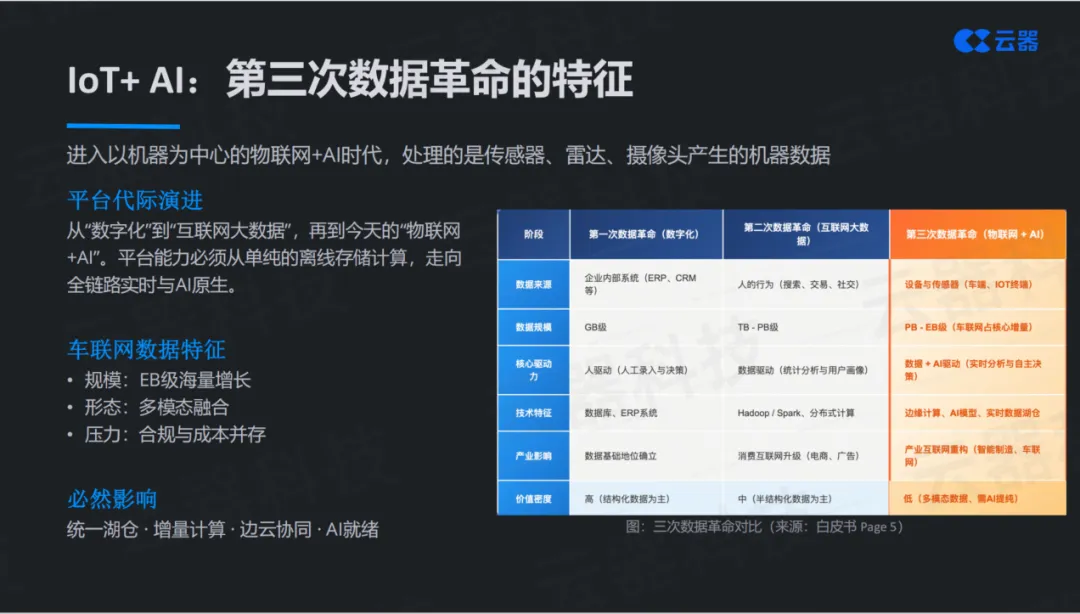 而今天,我们进入了以机器为中心的IoT+AI时代,处理的是"机器产生的数据"——传感器、雷达、摄像头源源不断产生的海量数据流。这一次革命的特征非常鲜明:数据规模从TB级跨越到EB级,数据形态从单一结构化走向多模态融合,业务压力从单纯存储计算演变为合规与成本并存。