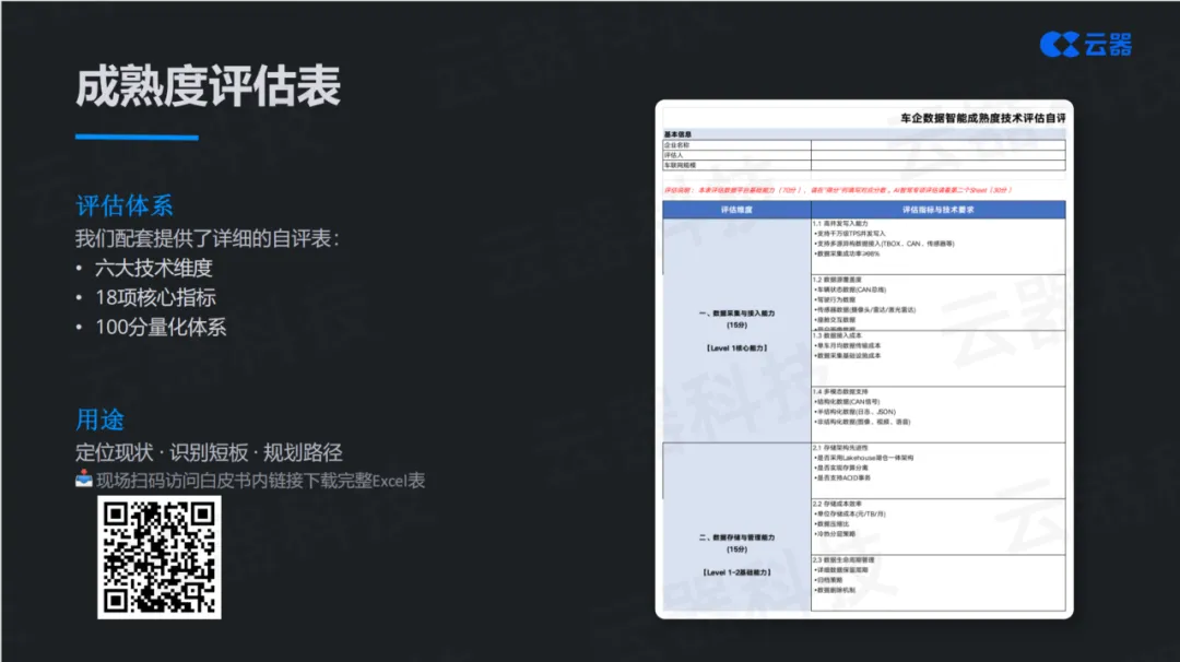 白皮书配套提供了详细的自评表,涵盖六大技术维度、18项核心指标、100分量化体系。企业可以通过自评,清晰定位自身所处阶段,识别短板,规划演进路径。这个模型的价值不仅在于评估现状,更在于指明方向——让车企知道自己在哪里,要往哪里去,以及如何一步步到达。