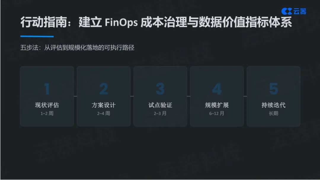 第五步是持续迭代(长期)。 数据平台不是一次性工程,而是需要持续优化的基础设施。随着业务发展和技术演进,需要不断迭代,建立FinOps成本治理与数据价值指标体系,让数据平台真正从成本中心转变为价值引擎。